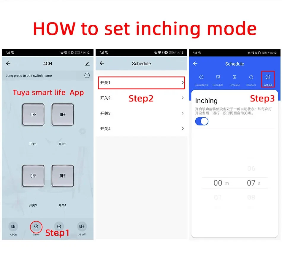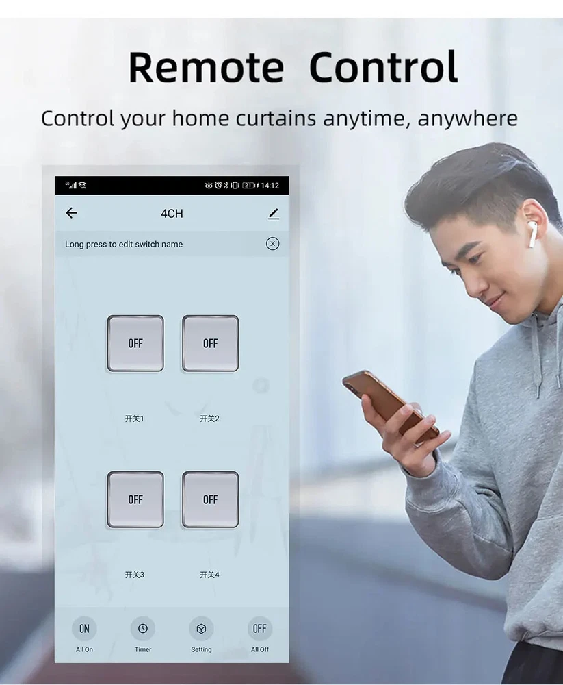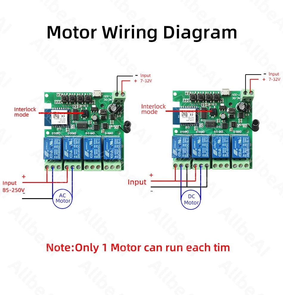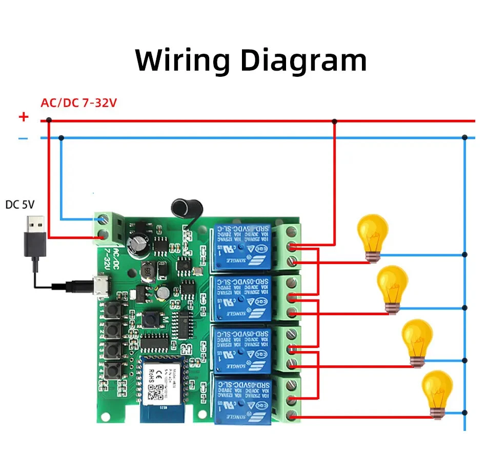 Package Listing Type 1: 4 Channel Wifi RF433 Relay Type 2: 4 Channel Wifi RF433 Relay+RF433 Remote Controller Type 3 : 4 Channel Wifi RF433 Relay+Case Shell Type 4: 4 Channel WIFi RF433 Relay+Case Shell+RF433 Remote Controller Type 5: 2 Pieces RF433 Remote Controller,no wifi relay Type 6 2 Pieces RF433 Remote Controller,no wifi relay Use For 1.Remotely give a pulse signal to turn on and turn off Lights,Lamps and other home appliance. 2.Remotely give a pulse signal to turn on and turn off Garage Door,Door Access 3.Remotely give a pulse signal to control DC Motor,AC Motor to Forward and reverse Overview Type 1,2 The RF433 remote controller (receiver) don't include battery battery type;27A 12V,The picture of the battery is in the end of the page. The WIFI module can be controlled by fix code EV1527 RF433 remote controller,and it can't controlled by rolling code remote controller. Note The relays is passive output(dry contact), No matter how many power you supply in the input, the output don't have any voltage, you also need to supply power in output. The power supply in the input just can make PCB board work.if you do not supply power in output, the connectted device can't work. 3 Working Modes 1.Self-locking : each channel could be switched on/off seperately.You also can turn on/turn off all channel at the same time. 2.Interlocking mode : Switch on any channel , other channels will be switched off automatically . 3.Inching mode(jog mode) : Switch on one channel,the channel will be automatically closed after 0.5 seconds .Other channel is same as the channel. If you need to change the mode,you need to press the mode button or active other working mode in the app. How to Change the Inching Time If you need to change the inching time. You need to press the mode button to enter into self-locking mode or interlocking mode,so you can change the inching time on the APP. The inching time only available in the self-locking or interlocking mode) The time range is 2-3600 seconds. Features: 【Two Input Ports】 You could choose USB 5V port or the screw terminal port to supply power in the input to make the pcb board board work. 【Dry Contact/Passive Output】 No matter the power you supply in the input, the output don't have any voltage If you do not supply power in output port, the connectted home appliance can't work, you also need to supply power in output. 【Timer】 The connectted home appliances can be automatically turned on/off according to the time schedule. Each channel can set different time schedule. Different Ways to Control the WIFI Module 【APP Remote Control】 You can control the connectted home appliance in Tuya or smart life APP anywhere and anytime.Such as light, electric kettle, electric rice cooker, electric curtain, etc. 【RF433 Control】The WIFI Module support RF433 Frequency,and you can control the WIFI module by RF433mhz remote controller. 【 Mobile Phone Control】 When you go outside or at home,You could control the module in your smart phone by 2.4Ghz WIFI or 2G/3G/4G Mobile Network. (Note:The router need to online and the WIFI module need to keep a close distance with the router) 【Voice Control 】 Compatible with Alexa and Google Assistant, you can use the voice control to turn it on/off the connectted home appliances . 【Share Control】 One device can control by Multiple phones,you can share the wifi module with your family member. 【Group Control】 one phone can control Multiple smart device.You can add the wifi module and other smart device in a group,and then turn on/off all smart device at the same time. 【Scene Linkage】 Creating smart scene to trigger ON/OFF all WIFI smart home appliances by departure mode, home mode, temperature, humidity, or other conditions. Description: Input1: USB 5V Port Input 2 :(screw terminal port): DC/AC 7-32V Output:Passive Output(Dry contact) Working frequency: 50-60Hz RF433 Frequency Working temperature: -20-70℃ Wifi standards/ protocol :IEEE 802.11b/g/n, WIFI 2.4Ghz Total load power(Output): 2000W/10A/gang Max Load(Output):3500w/16A/4 gang Max current(Output):`10A Size: 75*73*20 mm APP Remote Control You can remote turn on/off household appliances and set timing schedules to turn on/off the household appliances via app Tuya/Smart life anywhere anytime. such as lights, celectric curtains ,electric curtains fans. so you can enjoy an high-tech life. Timer Via app,you can set time schedules to automatic turn on/off the household appliances , such as lights, celectric curtains ,electric curtains fans. so you can enjoy an high-tech life. Case(Shell) Included Type 3 and type 4 include case(shell),and you can use it in different environment. Product Detail Wiring Diagram for Light/Lamp Wiring Diagram for RF433 Remote Controller Wiring Diagram for AC/DC Motor Only one motor can run each time. You can't run two motor at the same time. If you need to connect two motor at the same time, you can set interlocking mode to make sure only one motor to run each time. Wiring Diagram for Door Access Wiring Diagram for Electric Motor Lock The Electric Motor Lock must have K-, K+, GND, +12V ports. 2. K+ must be connected to the 12V port How to pair RF433 remote controller with with the devices. 1.Press the RF433 pairing button for 4 seconds,and wait until the blue led indicator turn on. 2.press any key of RF433 remote controller, and then you can pair the channel with one key of RF433 remote controller successfully If you need to pair other key of the RF433 Remote controller and other channel, you need to repeat the step. How to clear the pairing RF433 remote controller with with the devices. 1.Press the RF433 pairing button for15 seconds,and wait until the blue led indicator turn off. If you need to clear the pairing between other key of the RF433 Remote controller and other channel, you need to repeat the step. Battery of RF433 Remote Controller(Not included)