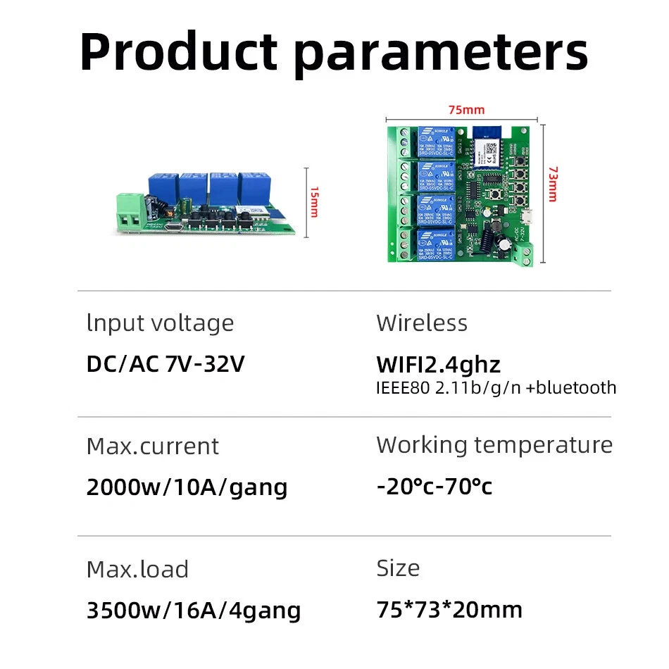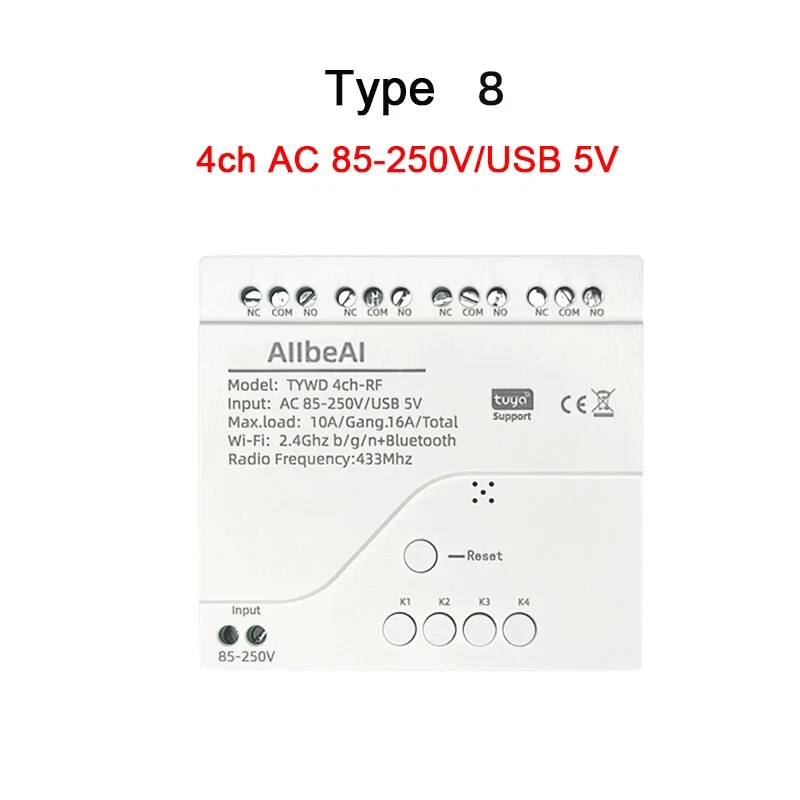 Input 2(Screw Terminal): AC/DC 7-32V Max Load: 16A 3500w for 4 gang APP Control: yes Certification: CE,FCC,RoHS Voice Control: Google Assistant,Amazon Alexa Echo,Alice Max Current: 10A 2200W for one gang Brand: Unbranded Phone System: Andriod,iOS Product Type: 12V 24V relay module Battery of RF433 Remote Controller: 27A 12V(not include in it ) NO,NC,COM Output: Passive Output(Dry Contact) Type: 12V 24V relay module Model Number: TY4CH-12VRF Origin: Mainland China Communication method: WI-FI Timer Time Schedule: yes Wireless Protocol: WiFi 2.4GHz(do not support 5GHz) Product: 4 Channel Pulse Relay Control Channels: 4 channels Drop shipping: Welcome drop shipper State of Assembly: Ready-to-Go App Name: Tuya Smart or Smart Life APP RF433 Frequency: yes Input 1: Micro USB 5V