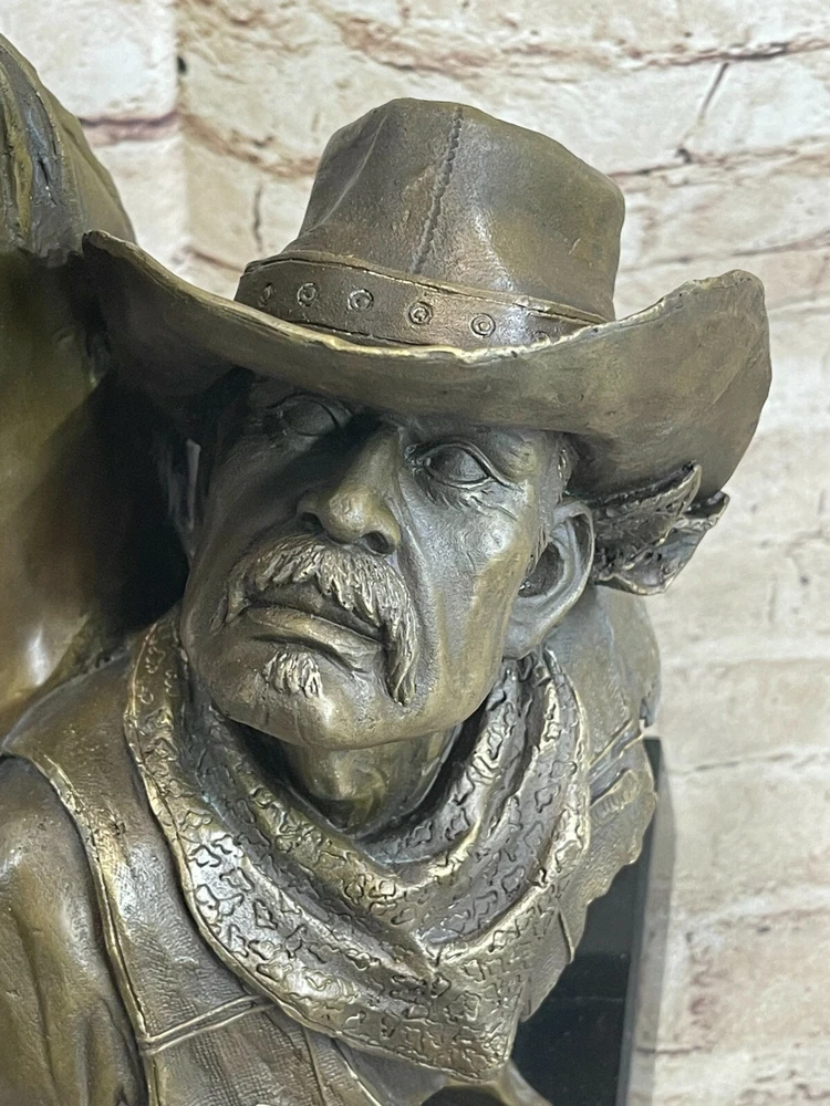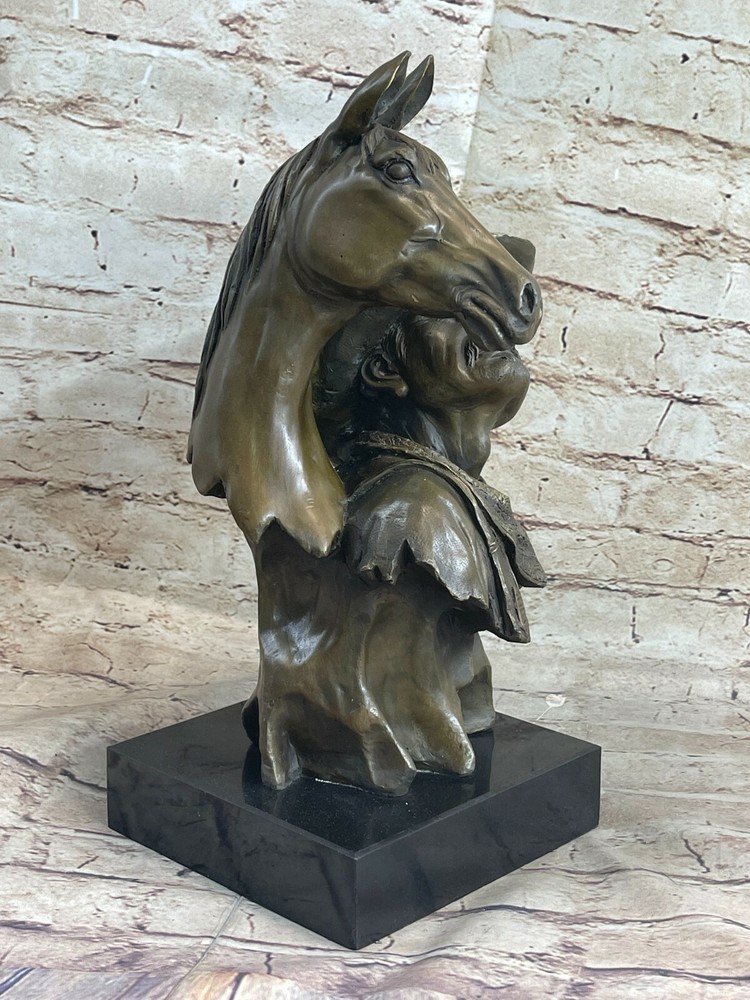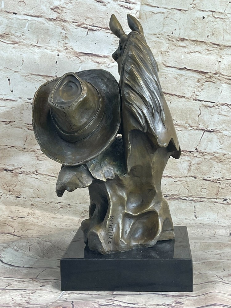 Condition : This sculpture is in perfect condition. Bronze Dimensions with Marble Base: Height 14" X Width 7" Marble Dimensions:6" X 6" Height without base:13" Weight:18 LBS Inventory:94YRD11897849 Introducing the "Trusted Companions" sculpture, where a cowboy and his horse unite in a timeless bond, ready to embark on an adventurous trail ride. Crafted meticulously in bronze, this exquisite piece showcases the harmony between man and beast. Perched upon a rugged terrain, the cowboy exudes an air of confidence, adorned in traditional cowboy attire. His chaps, vest, and intricately detailed cowboy boots epitomize the spirit of the Wild West. Accompanying him, the majestic horse flaunts a brown embellished breast collar, accentuating its regal stature. Meticulously crafted by hand, this sculpture embodies the mastery of the "Lost Wax Method," ensuring every intricate detail is captured in its purest form. Cast in 100% bronze and finished with a captivating brown patina, the artwork emanates a timeless allure. Gracing a solid black marble base, the sculpture stands as a testament to the artist's vision and skill. To authenticate its origin, the artwork bears the signature of the esteemed artist, Kamiko. Capture the essence of unwavering companionship with the "Trusted Companions" bronze sculpturemdash;a truly remarkable masterpiece that celebrates the unbreakable bond between man and horse. Western Art Old West Cowboy With Horse Bronze Bust Sculpture Marble Statue Decor www.bronzhaus.com Video will open in a new window Using the eBay App? Paste link into a browser window: [isdntekvideo]