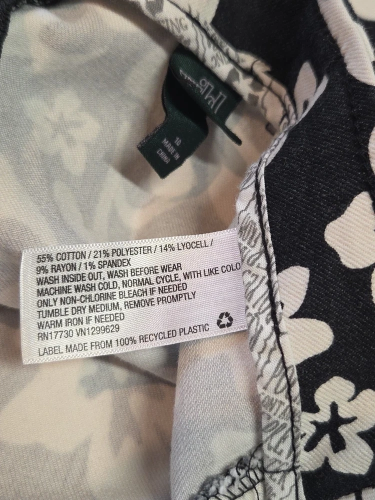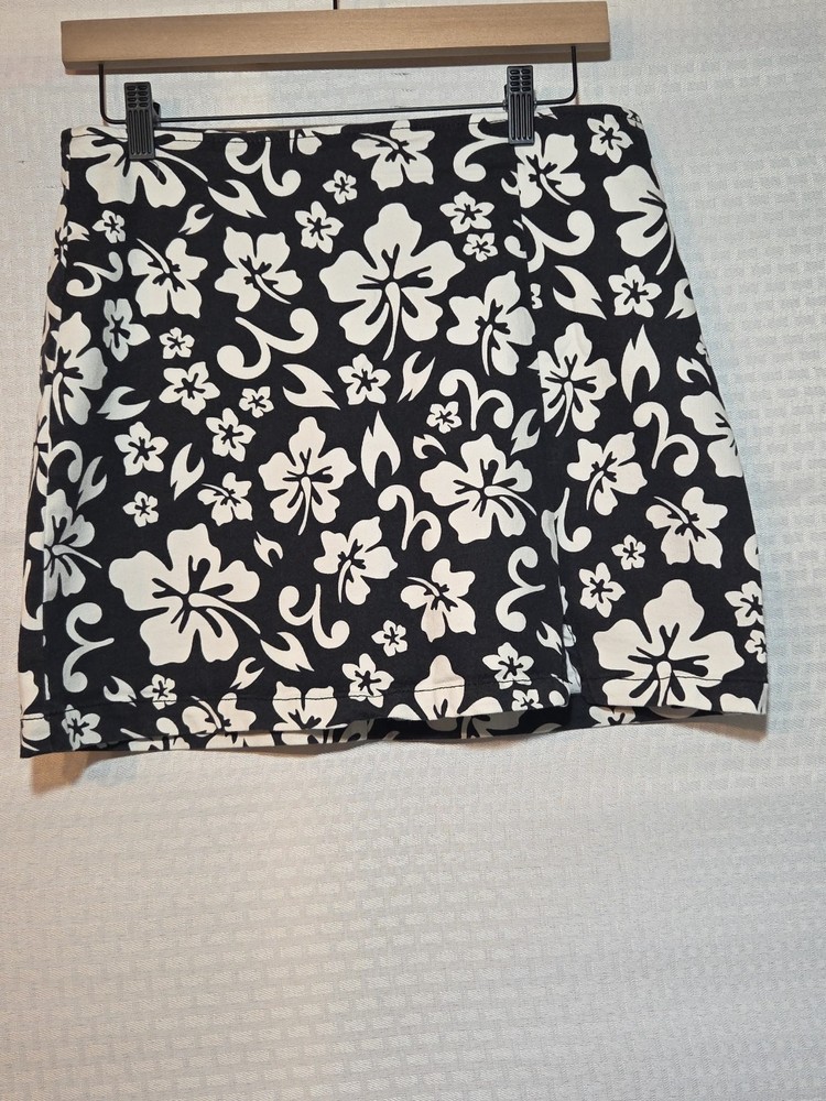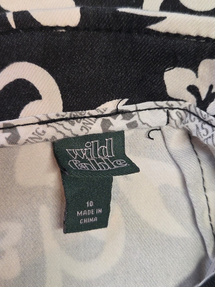 Trendy and bold, this Wild Fable floral mini skirt is a fun piece for casual days or summer outings. Brand: Wild Fable (Target) Size: 10 Color/Pattern: Black with white hibiscus floral print (Hawaiian/tropical vibe) Style: Mini skirt, straight cut Material: Not listed on tag (typical Wild Fable styles are polyester/cotton blends) Made in China Closure: Pull-on style (elastic not visible, but check waistband fit) Length: Mini – hits above the knee Perfect for summer, festivals, vacations, or pairing with a crop top and sandals. From a pet and smoke-free home