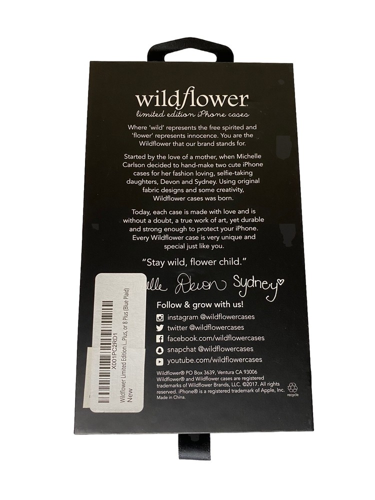 This Wildflower iPhone Plus Case is the perfect addition to your phone accessories. With a blue plaid design, it is both stylish and functional. It is compatible with Apple iPhones 6 Plus, 7 Plus, and 8 Plus, making it a versatile choice for any user. The hard cover type ensures durability and protection for your phone, while the brand's reputation for quality guarantees long-lasting use. The case is specifically designed for Apple devices, ensuring a perfect fit and easy access to all ports and buttons. New in box!