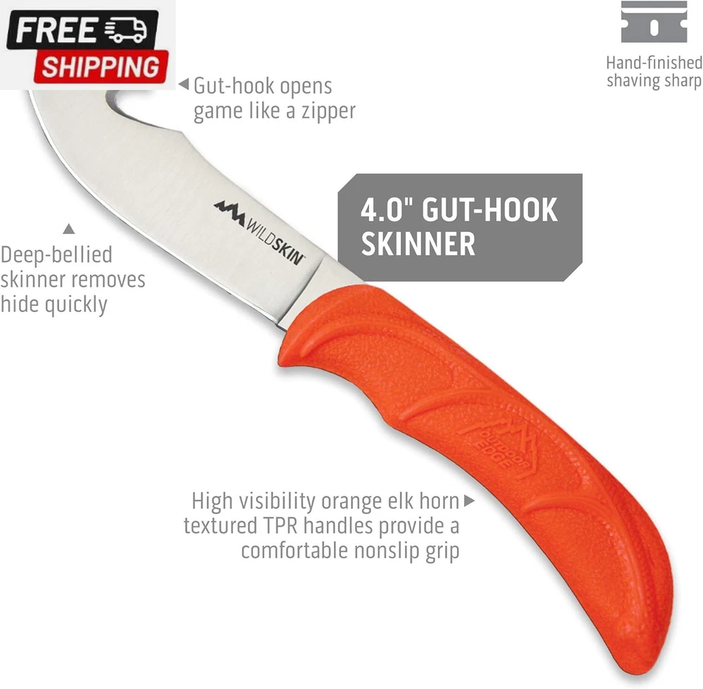 Wildguide 4-Piece Hunting Knife Set & Field Dressing Kit | Featuring Razor-Sharp Caping Knife, Gut-Hook Skinning Knife, Bone Saw, in a Camo Nylon Belt Sheath | Butcher Knife Set for Deer FIXED BLADE GUT HOOK SKINNER WITH SHEATH - Deep bellied skinner removes hide quickly and gut-hook opens game like a zipper without piercing internal organs; comes complete with a camo nylon belt sheath. RAZOR SHARP – Perfectly balanced full-tang 420J2 stainless steel blade is precisely heat treated, taper ground, then hand finished to a shaving sharp edge for superior edge retention and performance. RUBBERIZED NONSLIP TPR HANDLE – Ergonomically shaped, high visibility blaze-orange TPR handle reduces hand fatigue after long periods of use and ensures a safe and comfortable grip, even in the slickest conditions. QUALITY CAMO BELT SHEATH – Keeps the WildSkin clean, dry, and always ready. SERVICE FOR LIFE – Outdoor Edge produces quality tools that are built to last. If you have a problem with your Outdoor Edge knife contact us. We address all replacement and service requests. Product Description OUTDOOR EDGE WILD SERIES Outdoor Edge WILD Series Premium Fixed Hunting Knives Introducing the WILD Series of Fixed Blade Hunting Knives & Tools for in the Field Processing. All of the Wild Series sets of Knives & Tools Provides Outdoorsman all the right tools needed to prep & process from field to table. Shaving Sharp Edges All of the Wild Series hunting knife sets feature hand-finished edges for a shaving sharp experience. Rubberized TPR Handles Each of the Wild Series Products Feature Premium Non-Slip Rubberized TPR Handles for a superior in the field experience. Durable 420J2 Stainless Steel The Wild Series Features Heat Treated Blades for Superior Edge Retention & Cutting Performance. Easy to Transport All of the WILD Series products include either a convenient blow molded carry cases or durable nylon sheaths making transport and storage a breeze. WILD SERIES FEATURE CHART Add to Cart Add to Cart Add to Cart Add to Cart Add to Cart Add to Cart Add to Cart Customer Reviews 4.7 out of 5 stars 1,494 4.7 out of 5 stars 1,494 4.7 out of 5 stars 1,494 4.7 out of 5 stars 1,494 4.6 out of 5 stars 180 4.7 out of 5 stars 3,373 4.7 out of 5 stars 3,373 Price $37.90 $ 37 . 90 $21.95 $ 21 . 95 $34.95 $ 34 . 95 $16.95 $ 16 . 95 $11.95 $ 11 . 95 $34.90 $ 34 . 90 $48.55 $ 48 . 55 Rubberized TPR Handles Yes Yes Yes Yes Yes Yes Yes 420J2 Stainless Steel Yes Yes Yes Yes Yes Yes Yes Heat Treated Blades Yes Yes Yes Yes Yes Yes Yes Overall Weight 11.4 oz 8.3 oz 9.6oz 4.5 oz 2.6 oz 1.2 lbs 2.4 lbs Carry Case/Nylon Sheath ✔ ✔ ✔ ✔ ✔ ✔ ✔ Outdoor Edge Knives & Tools Lifestyle The video showcases the product in use. The video guides you through product setup. The video compares multiple products. The video shows the product being unpacked. Shipping Fast shipping is very important for us. Our standard US shipping service is FREE. Your order will be shipped within 2-3 business days upon full payment received. Your order will be delivered within 2-3 business days after the handling time. We only ship to the confirmed PayPal address. We reserve the right to cancel any order for any reason at any time. We are not responsible for undeliverable addresses. Returns and payment We offer a 30 days return policy from checkout winning date. We allow only PayPal as payment method FeedBack Your feedback very important to us, after you get your package and you are satisfied with our service please leave us positive feedback If you have any problem with your order / any questions please before leave any type of feedback For any questions, using eBay contact system Please visit our eBay store to check out other items for sale! Thank you for shopping at our store.
