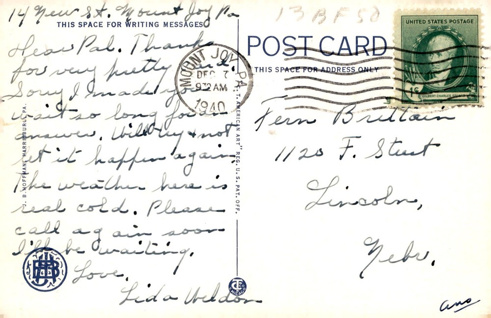 Scenic view of Wm. Penn Highway and Susquehanna River near Harrisburg, PA. Sender apologizes for the delay in writing and mentions the cold weather. They express eagerness for a call back.