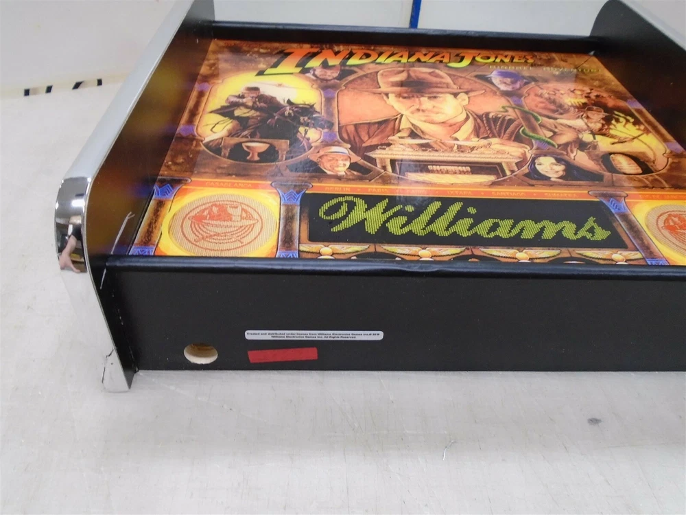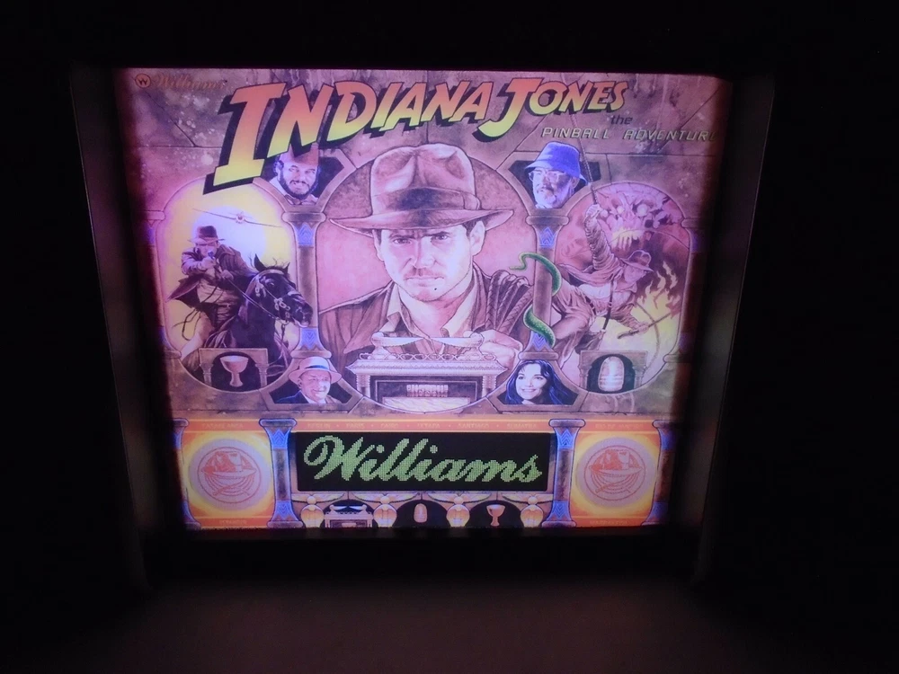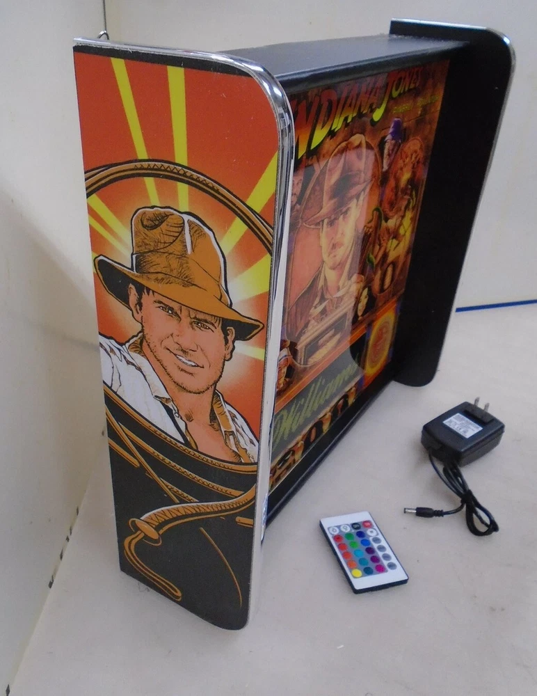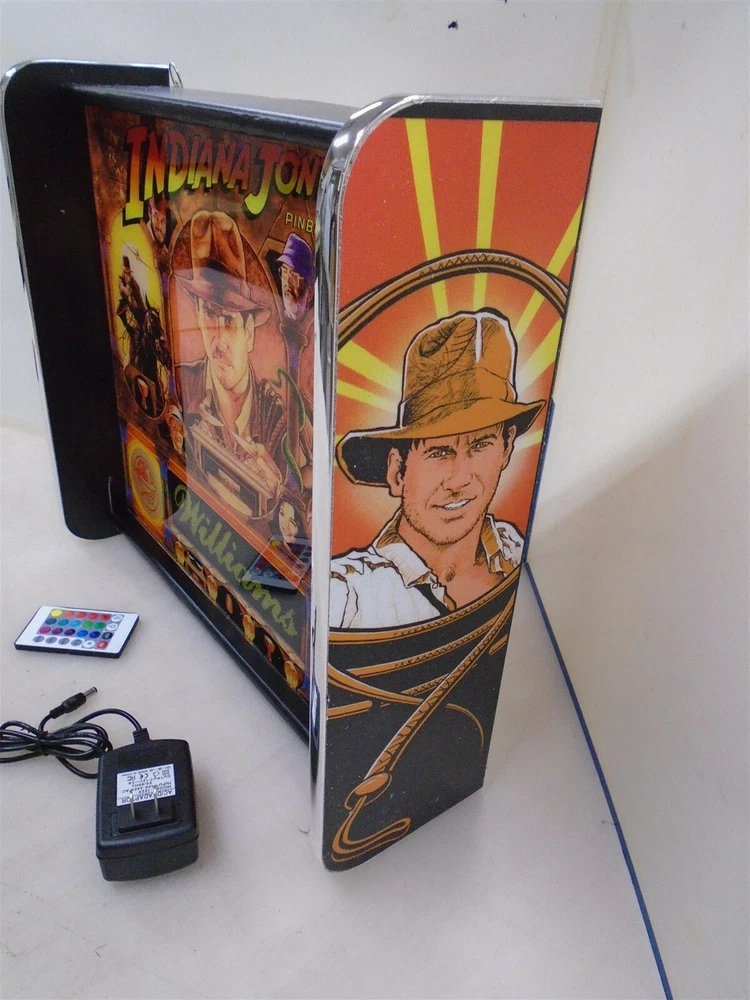 You are Bidding on a Williams Indiana Jones Pinball Head LED Display light box This sign is hand crafted in the USA It is a scaled down pinball backbox with Vinyl Graphics applied to plywood frame and Black melamine end caps with actual scaled down head decals The Backglass in it is brand new and is made of Lexan Comes with hooks to hang it on the wall Powered by LED strip lights with a 24 button remote control to run them , they can change colors and flash and do all kinds of cool stuff Overall dimensions are 17" wide 16" Tall 5 " deep Comes with the 12 volt power supply and remote I Will combine Shipping on Multiple auctions We ship Internationally Powered by SixBit's eCommerce Solution