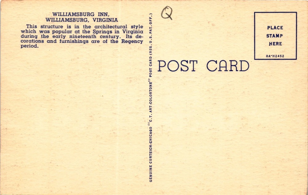 The Williamsburg Inn in Williamsburg, Virginia, is a historic structure designed in the architectural style popular in Virginia during the early nineteenth century. The inn is known for its Regency period decorations and furnishings. Williamsburg itself is a well-known historic city in Virginia, famous for its restoration and preservation of colonial-era buildings and landmarks.