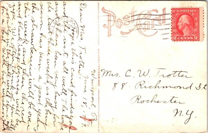 Region:PennsylvaniaOriginal/Licensed Reprint:OriginalTheme:Architecture, Cities & Towns, Community Life, Domestic & Family Life, Occupational, Patriotic, FlagCountry of Origin:United StatesCity:WilliamsportPostage Condition:PostedCountry:United StatesUnit of Sale:Single UnitNumber of Items in Set:1Continent:North AmericaEra:Divided Back (1907-1915)Material:PaperType:Printed (Lithograph)Subject:Post Office