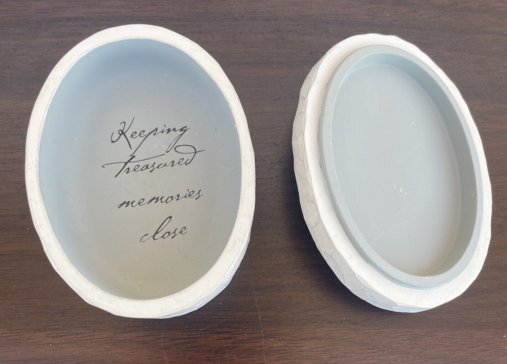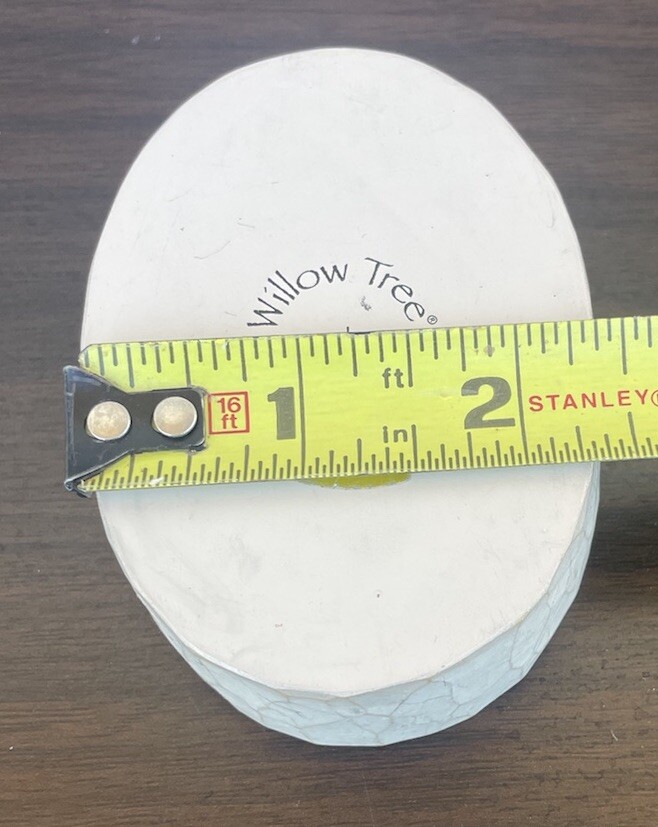 This charming Willow Tree trinket box is a wonderful addition to any collection. Crafted in an elegant oval shape, this decorative piece is perfect for storing small keepsakes and trinkets. Made in 2004, it is a great way to remember a special year or occasion. The box features delicate and intricate details, making it a lovely display item as well. Ideal for collectors of decorative boxes, this Willow Tree trinket box is a must-have.