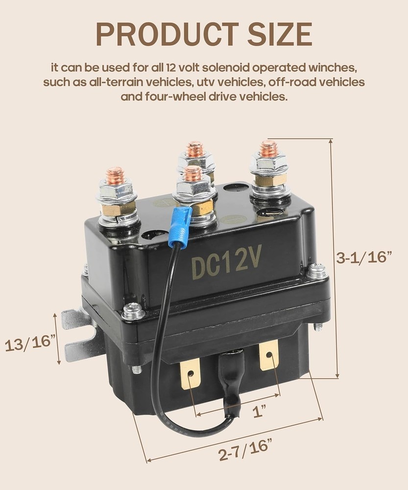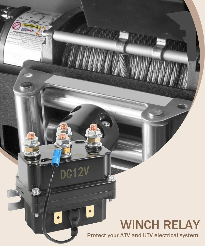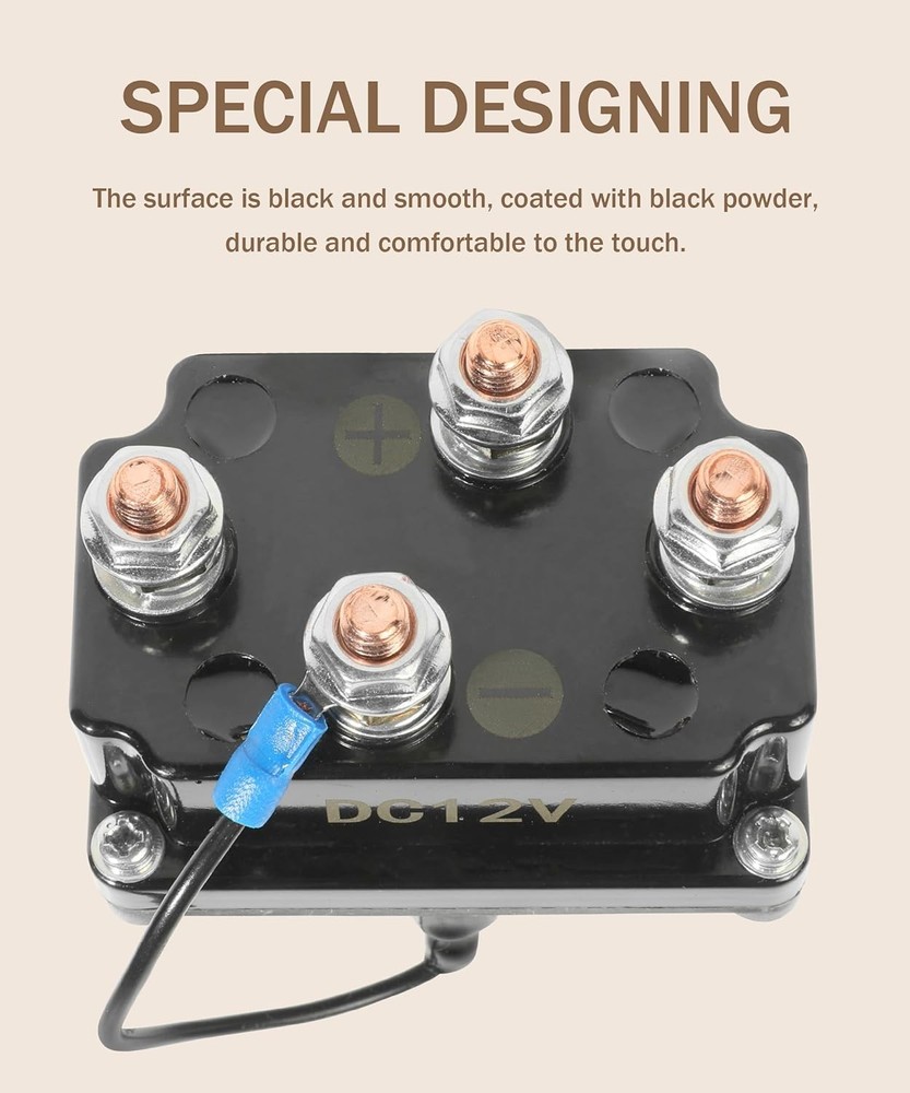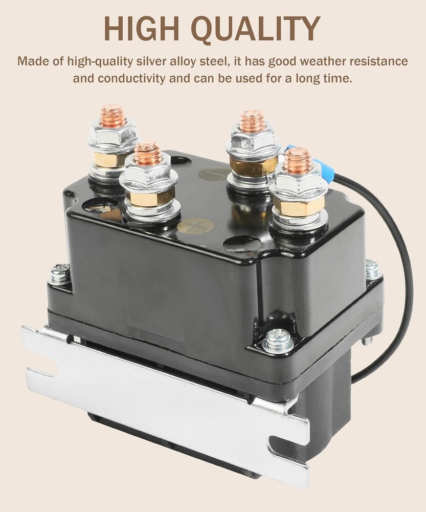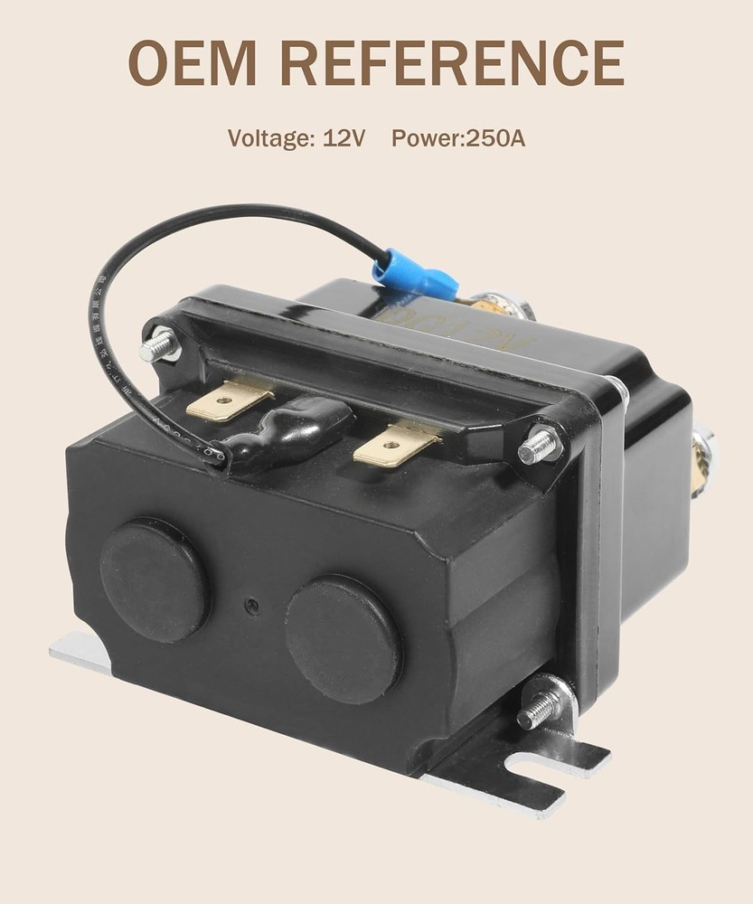 Winch Solenoid - 12V 250A Car Accessory, Reversing Contactor Switch for 3000-5000lbs ATV UTV Truck Winch Control Product Details Connector Type: Screw Terminals Contact Material: Silver Current Rating: 250 Amps Mounting Type: control box mount Brand: bylikeho Operation Mode: Manual Wattage: 30 watts Coil Voltage: 12 Volts Minimum Switching Voltage: 12 Volts Manufacturer: bylikeho Model: 1273JPJDQ001 Item Weight: 15.3 ounces Product Dimensions: 1 x 1 x 1 inches Item model number: 1273JPJDQ001 Manufacturer Part Number: KTLXTJ0001 Connector Type: Screw Terminals Contact Material: Silver Current Rating: 250 Amps Mounting Type: control box mount Brand: bylikeho [High Quality Materials]The electromagnetic valve relay is made of high-quality silver alloy steel, which has good weather resistance and conductivity and can be used for a long time. [Specification] Voltage: 12V, power: 250A, coil power: 30W. Main Function] This 12V 200A winch contactor is mainly used to protect the electrical systems of ATV and UTV, and to switch the power distribution of the winch. [Easy to Install] The replacement of the winch contactor fully meets OEM specifications and quality, with pre cut mounting brackets for easy installation into the control box. [Application] The winch relay can be used for all 12 volt electromagnetic operated winches, such as ATV'S, UTV'S, SUV'S, 4x4 vehicles, and most other brands of recycling winches, such as 12 volt jacks, hydraulic pumps, trailers, etc. Voltage: 12V Power: 250A Coil power: 30w What will you get in the box? -1 x 12V 250A winch relay Our product advantages -Made of high-quality silver alloy steel, it has good weather resistance and conductivity, and can be used for a long time -Mainly used to protect the electrical systems of ATV and UTV, and to switch the power distribution of the winch -Fully compliant with OEM specifications and quality, pre cut mounting bracket for easy installation into the control box -Can be used for all 12 volt electromagnetic operated winches