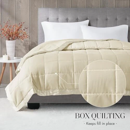 For year round warmth, the Windom microfiber down alternative blanket is the perfect fit. This microfiber blanket features a 3M Scotchgard Moisture Management Treatment that wicks away moisture, keeping you warm and dry through the night. Down alternative filling provides extra warmth and softness, while the sewn-through box-quilting prevents the fill from shifting. The satin binding elegantly frames this blanket, creating a rich finished edge that is perfect for displaying on your bed. Machine washable for easy care, this microfiber blanket will keep you warm and comfortable through all seasons. NEW & TRENDY - Search no further for your new cozy blanket, Windom microfiber blanket offers colors complimenting the luxurious double sided box quilting design accented with satin binding. Brushed microfiber fabric offers a super soft and lofty cover to keep you warm and cozy, while still giving a lightweight and wrinkle resistant design. BETTER SLEEP - We simply offer you a really soft and cozy high quality brushed microfiber blanket. It features a 3M Scotchgard Moisture Management Treatment that wicks away moisture, keeping you warm and dry through the night. The treatment also helps most stains come out in the wash. ALL SEASON - Our all season blanket offers a soft and lightweight material perfect Summer blanket and warm enough for Spring season. Collection aims to offer you a better quality sleeping experience. In the winter our blanket can be the perfect layering piece, adding a decorative element of soft texture for extra warmth and coziness during the cold season MAKE IT LAST - It will last if you maintain it by using machine wash cold on gentle cyle only, and tumble dry on low heat. And NO BLEACH. Commercial size front loading washer is recommended INCLUDES - 1 Blanket: 90"x90"