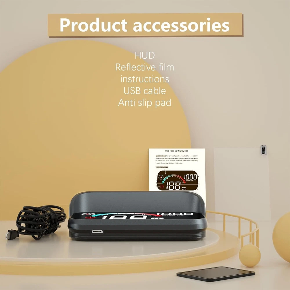 【What is M22 hud】M22 is a GPS mode flat screen display, unlike most flat screen displays on the market, our designers have made good use of the windscreen to turn M22 into a new windscreen HUD. 【Design Concept】This GPS speedometer is a novel design with a colour scheme for the first time. It presents important speed data to the driver at a glance and is simple to understand. 【Main Functions】The M22windshield speedometer projector displays speed, clock, travel time and distance travelled. It also has an over speed alarm function and a GPS compass to show the direction(The compass needs to locate the satellite before it can be used. You can try moving the car to an open road surface.). Speed is available in MPH and KM/H, which can be adjusted in the settings. When there is an over speed, the product will emit a beeping sound to remind the driver, which is like a safety supervisor, always reminding the driver to pay attention to driving safety, placing a beautiful M22 HUD in the car. 【Automated HUD】The advantage of the digital speedometer automation is that it turns on automatically when the car starts and turns off automatically when the car is switched off, which is very convenient and you don't have to worry about the product not being able to turn off. A gentle reminder, if you are not driving for more than a week, please remove the product and put it in the drawer. 【Instructions for use】 Our product is easy to install, plug and play, just use the usb cable included in the product to connect the car and the product, start the engine to power on and use. When you notice the small icon on the product flashing continuously, it means the product is collecting satellites, the speed will only be displayed when the device searches for satellites. 【Note】Please note the following three important information, ①In garages, overpasses and dense buildings will affect the search speed ②When the same GPS device is installed in your car, it will also affect the search speed of this product, i.e. two GPS devices cannot be placed together ③When your car has metal film, it will also affect the search speed of this product. 【Reminder】Inaccurate speed: Check if the unit is correct, kilometers (KM)/miles (MPH), (refer to the 5 settings for speed unit switching). You can also adjust the vehicle speed, such as the instrument displaying 100 km/h and the machine displaying 105 km/h. Adjust the parameter value to 102. During the day, the data cannot be seen clearly and there is a reflection: stick a reflective film to make the data reflect on the reflective film. You can also enter the fourth setting to adjust the brightness. 0 is the automatic light sensing mode, and 1-11 is the manual adjustment. You can manually increase the brightness.