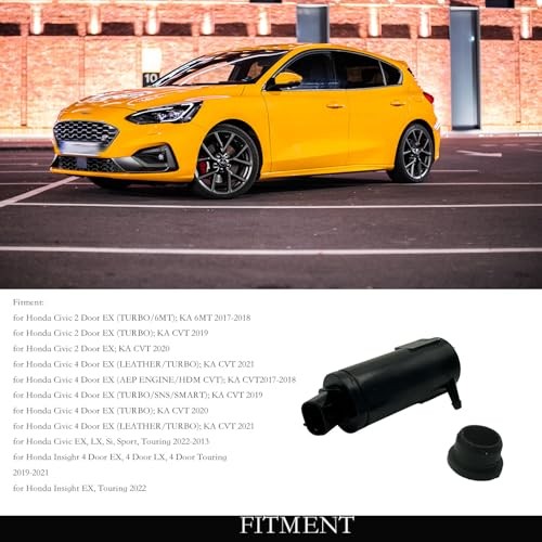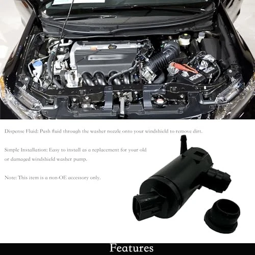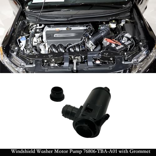 Windshield Washer Pump 76806-TBA-A01 Replacement for Honda Civic, Insight w/ Gro Windshield Washer Pump 76806-TBA-A01 Replacement for Honda Civic, Insight w/ Gro Windshield Washer Pump OE number/Part Number: 76806-TBA-A01/76806TBAA01. Windshield Washer Pump Fitment: for Honda Civic 2017-2021, for Honda Civic 2 Door EX (TURBO/6MT), KA 6MT 2017-2018, for Honda Civic 2 Door EX (TURBO), KA CVT 2019, for Honda Civic 2 Door EX; KA CVT 2020, for Honda Civic 4 Door EX (LEATHER/TURBO) KA CVT 2021. Benefits of Washer Pump: Crafted from sturdy plastic and rubber, this windshield washer pump is durable, corrosion-resistant, and crack-resistant. It is a good solution for replacing your current pump if it is damaged, cracked, or no longer functional. This pump effectively resolves any windshield washer issues by ensuring leak-free operation and dispensing washer fluid efficiently. Easy to install: To replace your old or broken windshield washer pump, connect the inlet and outlet hoses, secure the motor in place, and power it up to start pumping water. Remember to follow the instruction manual for detailed guidance. Package Includes: 1 Pcs Windshield Washer Pump, 1 Pcs Grommet. Note: Due to the light and screen difference, the product's color may be slightly different from the pictures.