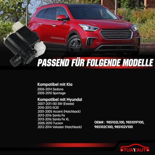 Windshield Washer Pump Replacement for Hyundai Kia w/ Grommet 985102L100 Windshield Washer Pump Replacement for Hyundai Kia w/ Grommet 985102L100 Replacement for 2012-2014 Hyundai Veloster / 2013-2017 Santa Fe / 2007-2012 Veracruz, 2006-2014 Kia Sedona / 2005-2010 Sportage, the guarantee of quality and product testing. Meets strict OEM standards - Replaces OEM #: 985102L100, 985101F100, 985102C100, 985102V100, 98510-2L100, 98510-2C100, 98510-25100. Superior environmental material, push fluid through the washer nozzle out onto your windshield to wash away the dirt. Comes with 1pc 12V washer pump, 1pc rubber grommet, easy installment, perfect replacement. We are glad to provide friendly customer service, a 30-day return refund, and worry-free 12-month quality.