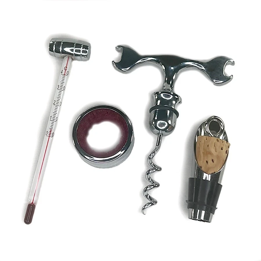 For the person who loves wine is this 4 piece connoisseur set to ensure a perfect glass of wine. Coming in a cherry box, there are 4 tools to use...a thermometer, a drip ring (lined in maroon), a cork screw and a cork stopper. This set is like new...never been used and in great condition. Makes a good gift.