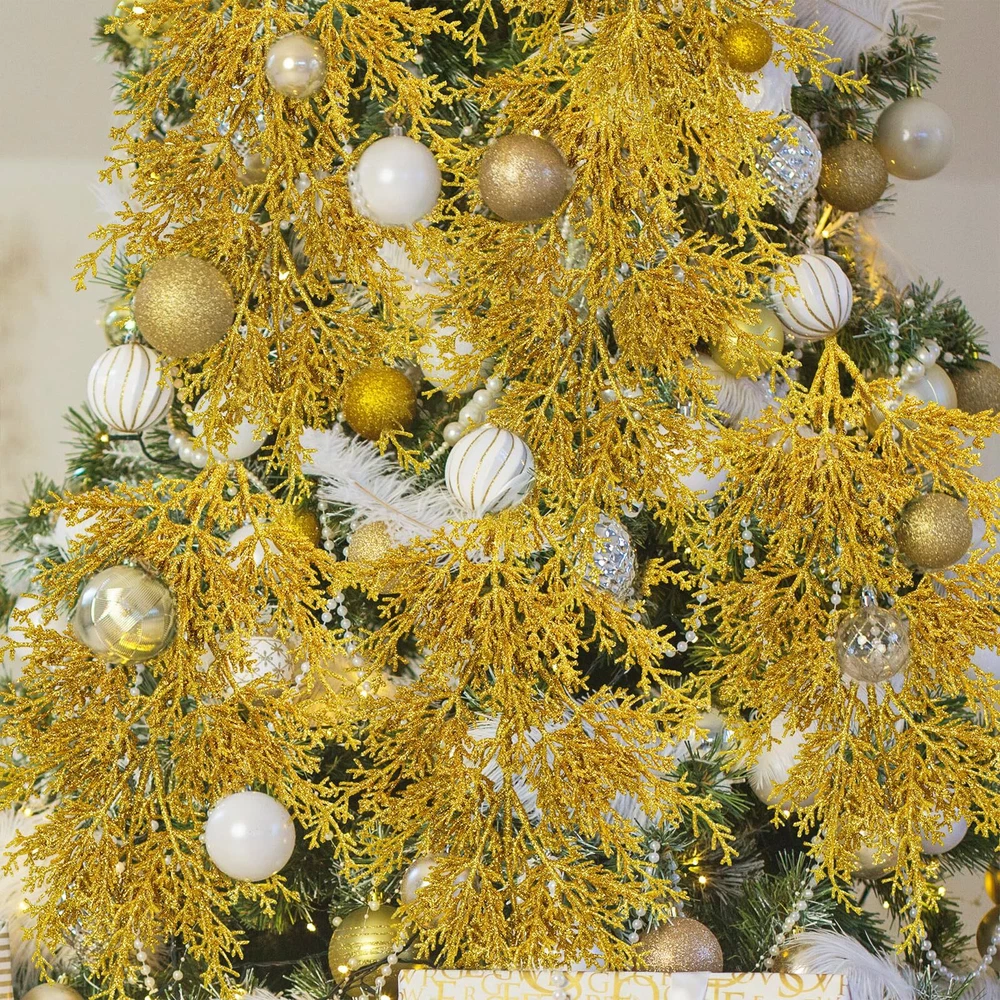 Quantity: Package includes 6 pcs gold glitter artificial cedar picks. Each one has 9 branches and many sprigs, and looks more lush. With a flexible stem, they can be easily placed. You may use these glitter gold cedar stems in a clump or separate into individual stems for any holiday decorating project. They can be used for a variety of crafting and decorating endeavors. Add a modern and gorgeous element to your festive decorations and create a festive display in your home. Color: These gorgeous artificial cedar pine branches are bright gold. A central stem extends to take hold of diverging branches, which then branching off into smaller twigs, making for a realistic spray. The surface is covered with glitter powder, making them sparkly and eye-catching. Their golden look complements any themed holiday decoration. Great to use for your Christmas, weddings, winter parties, holidays, or any other special occasion that calls for a little sparkle! Size: Each gold Christmas tree pick measures about 19.5" tall and 7.1" wide, which is a perfect size for filling the Christmas tree, wreaths and garland. Their stems are also long enough to fit into vases, boxes, glass bottles, jars, pitchers, or other containers. You can adjust the stems to the width and length for you want. Make a Christmas centerpiece arrangement on any dining table, mantel, office desk, shelf, or any room in your home for a festive holiday look. Material: These faux cedar sprays are made of plastic and covered throughout with gold glitter. They look charming and shiny. And their plastic stems can be folded and bent at will, so they can be adjusted according to your decorating needs. These beautiful shiny glitter Christmas flower picks will always add sparkle to your holiday decorations. They are durable and will not break easily, can be reused, and will provide long-lasting beauty for years to come. Create a sparkling winter ambiance with our gold glitter cedar pine branches. Add some sparkle and texture to your Christmas tree, Christmas wreaths, garlands, and swags, Christmas centerpieces, seasonal floral arrangements, holiday table displays, winter wedding bouquets, wedding flower decorations, or embellish holiday gift wrap. They will sparkle anywhere in your home. Display them on your shelf, mantel, dining table, kitchen countertop, and more for a beautiful look.
