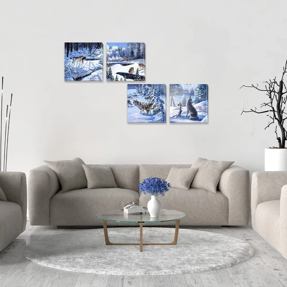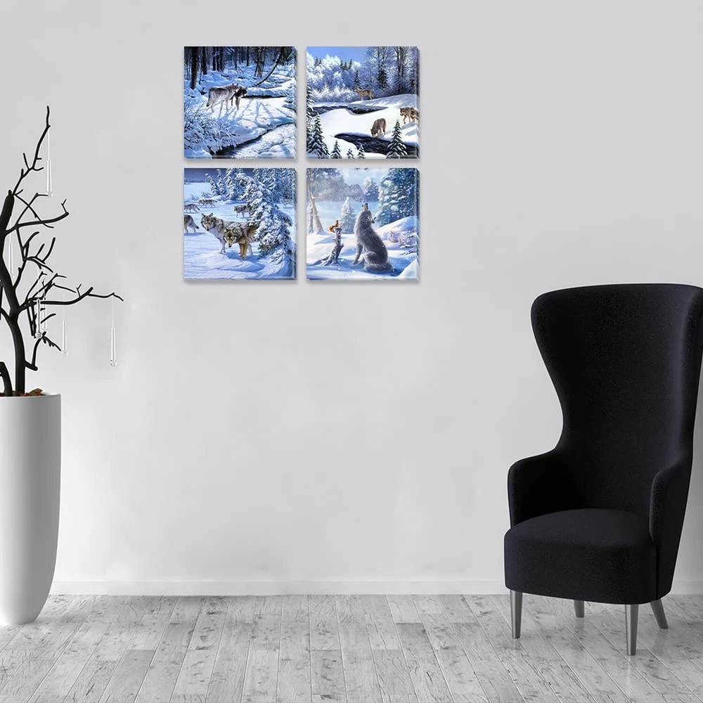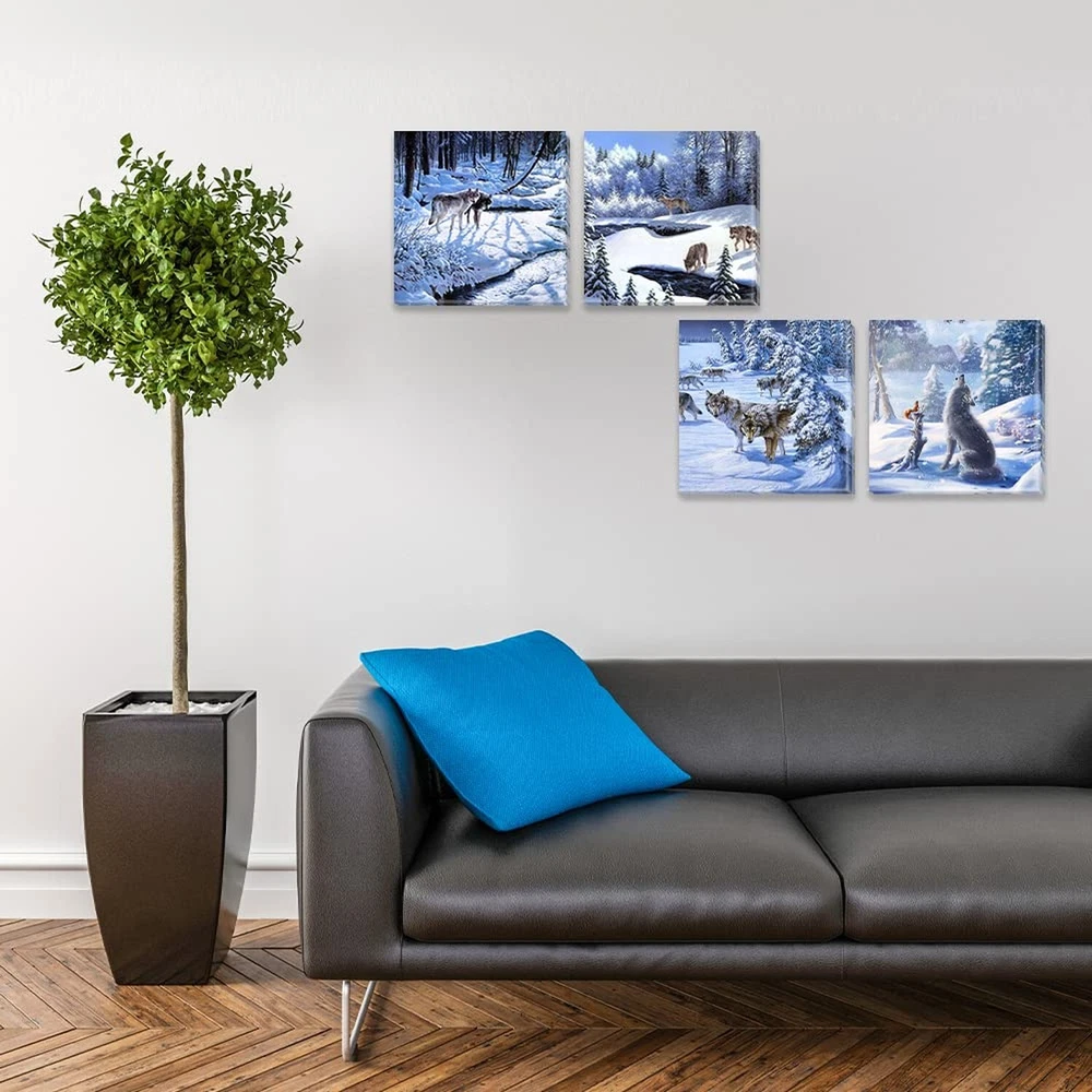 Winter Wolf Canvas Prints Wall Art Paintings 4 Pieces Blue Snowy Forest Landscape Pictures Artwork for Living Room Bedroom Bathroom Wall Décor 12"x12" Product Details Size: 12"x12"x4 Pieces Color: A Brand: Yarou Art UPC: 612769650176 EAN: 0612769650176 MPN: Does not apply Product Dimensions: 12 x 12 x 0.01 inches Item Weight: 1.96 pounds Manufacturer: Yarou Art Date First Available: July 4, 2022 Wolf Pictures Wall Art Size:Snow wolf wall art,snowfield wall decor,snow forest paintings,blue winter landscape pictures,individual 4 panels,12"x12" each.Designed for the winter season,the wolves walk freely and leisurely on the snow.Such a quiet and peaceful landscape artwork brings people an infinite good mood.For theme:living room wolf pictures,bedroom wolf pictures,bathroom wolf pictures,kitchen wolf pictures,office wolf pictures,nursery wolf pictures,hotel wolf pictures... Premium Canvas Printing:Printed on high-quality waterproof and fade-resistant canvas using high-definition printing technology.The pictures are crisp and bright,the colors are rich and deep,the details are lively and interesting,and the canvas is waterproof and fade resistant.Suitable for living room snow landscape decor,bedroom snow landscape decor,bathroom snow landscape decor,kitchen snow landscape decor,office snow landscape decor,farmhouse snow landscape decor... Winter Landscape Canvas Art:4 impressive winter landscape paintings of snow wolf and snow forest.The blue winter ice and snow world,the white snow forest covered by snow,the wolves walking together in the day or night,they stroll leisurely,drink water for food,or howl freely,everything is vivid is portrayed in this canvas world.Such beautiful animal landscape artwork can be calming and relaxing.Due to monitor display issues,actual colors may slightly differ from pictures. Snow Forest Wall Art Framed:Our framed landscape canvas pictures perfectly recreate the look and feel of the original image or painting.Winter landscape art snow forest paintings wolf pictures are framed and equipped with nails and hooks,which are easy to hang.The 4 independent panels can be combined or hung individually,and can be hung according to your own preferences.They can perfectly set off your slightly drab walls and bring some cuteness and warmth to your room. Best Service:Winter landscape art,winter snow art,snow forest art,snowy landscape art,blue snowfield art,snow wolf art,animal wolves art...Yarou Art is a guarantee of quality.Each landscape canvas painting snow canvas picture wolf canvas art print is packaged in transparent packaging,and then placed in a carton for careful packaging.We will check the canvas and borders to make sure that every wall is flawless,so please feel free to buy.