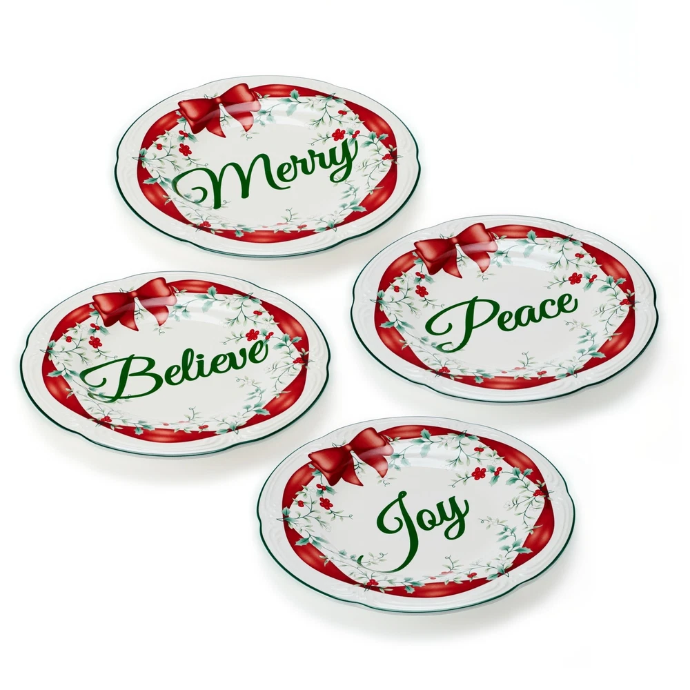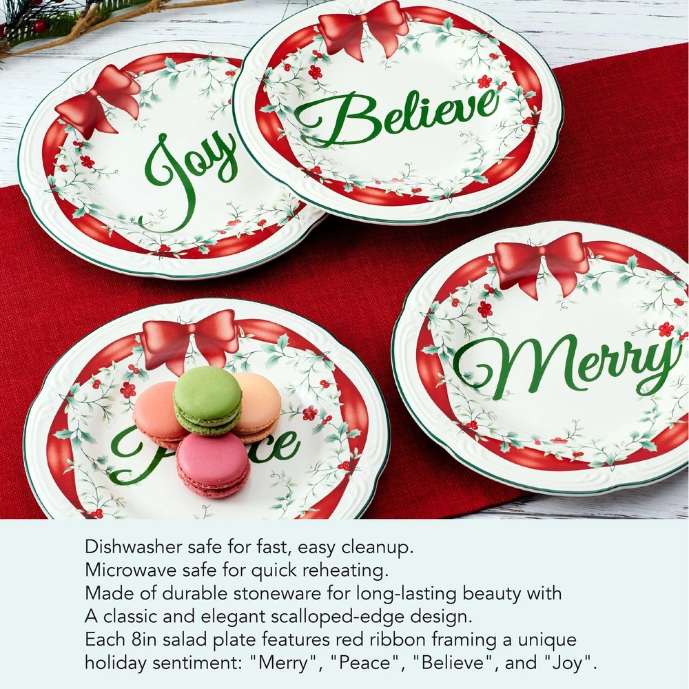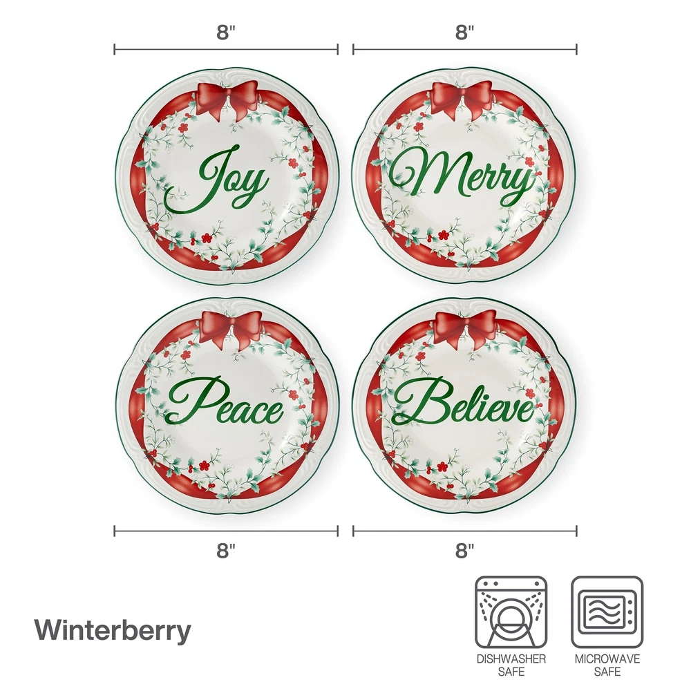 As fall turns to winter, bright holly berries make their appearance. The Winterberry collection is the holiday classic that brings this timeless motif to life in elegantly sculpted dinnerware and serveware, beautiful glassware, and joyous giftware. Each salad plate in this set of 4 features red ribbon framing a unique holiday sentiment: Merry, Peace, Believe, and Joy. Made of stoneware for long-lasting beauty with a traditional scalloped-edge design, these plates will be enjoyed at all your Christmas gatherings for years to come. Set of 4 salad plates, each measuring 8 inches in diameter by 1-inch high. Microwave and dishwasher safe. TIMELESS HOLIDAY MOTIF: Winterberry celebrates the holly leaves and berries that make their appearance each winter and are an iconic symbol of the Christmas season UNIQUE SENTIMENTS: each salad plate features red ribbon framing a unique holiday sentiment: Merry, Peace, Believe, and Joy BEAUTIFULLY CRAFTED: made of durable stoneware for long-lasting beauty with a classic and elegant scalloped-edge design SET OF 4: each salad plate measures 8 inches in diameter by 1 inch high EASY CLEANING AND REHEATING: dishwasher safe for fast, simple cleanup, and microwave safe for quick reheating