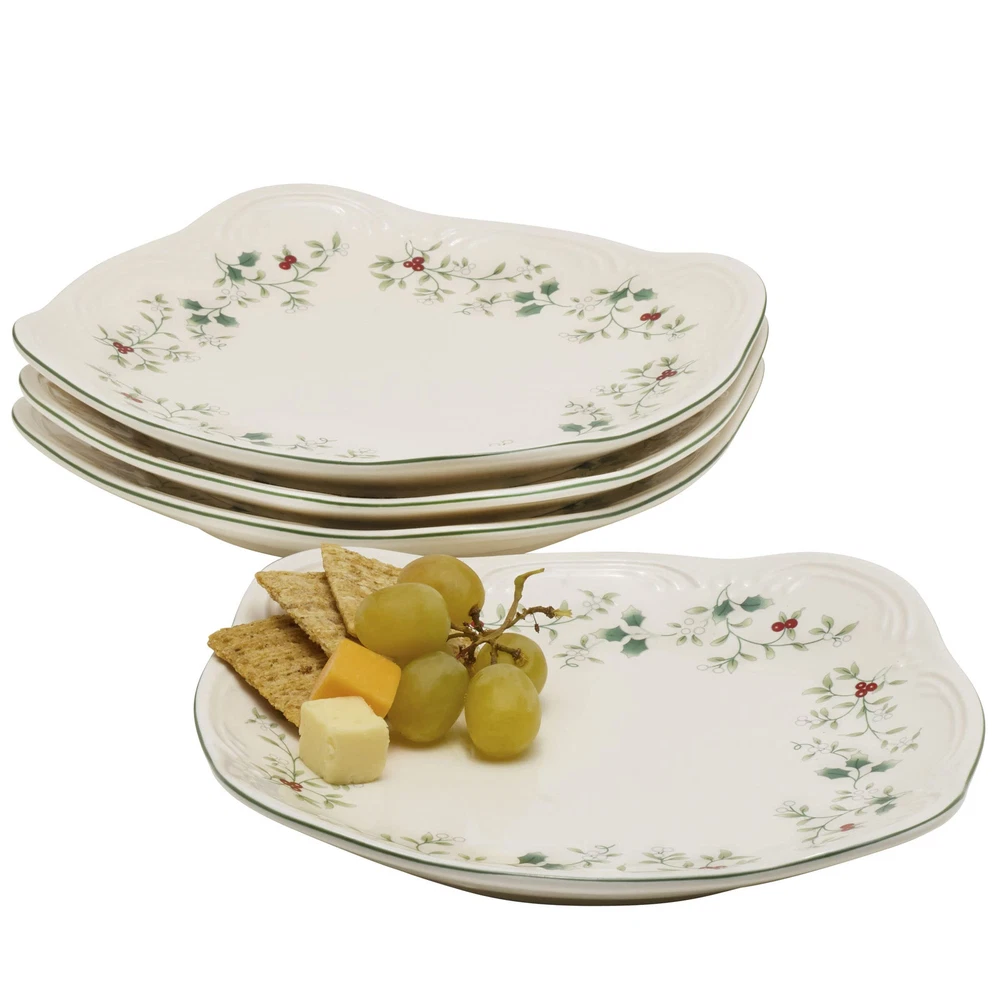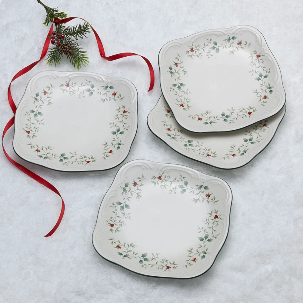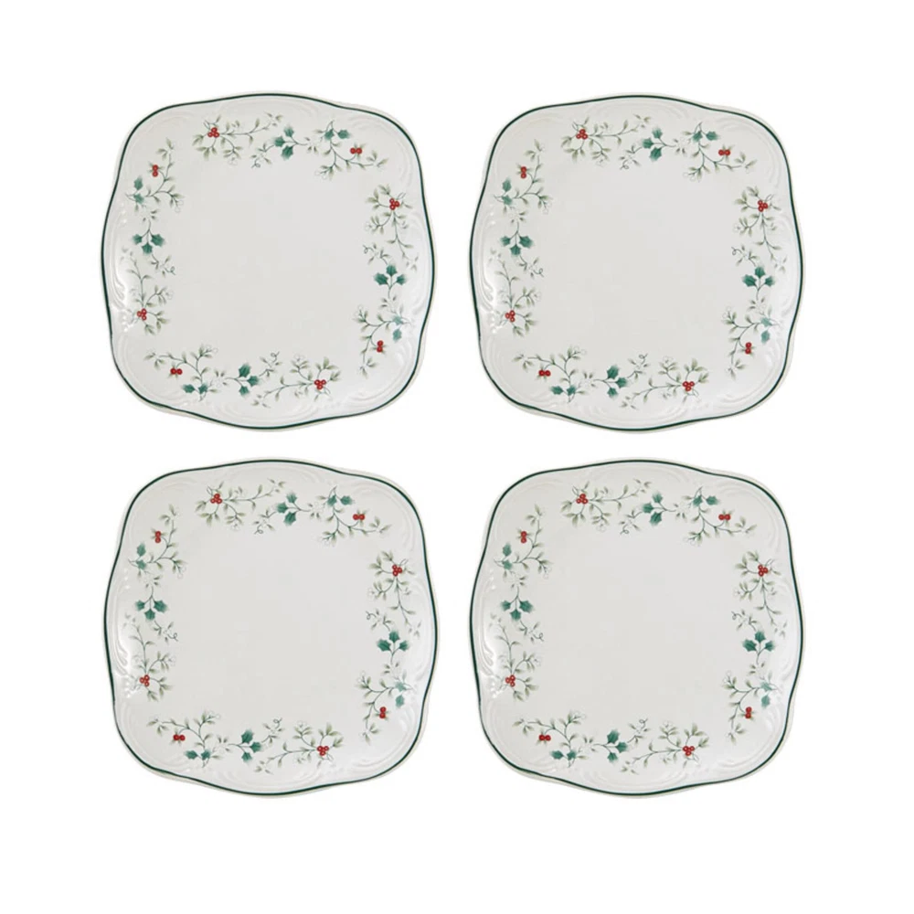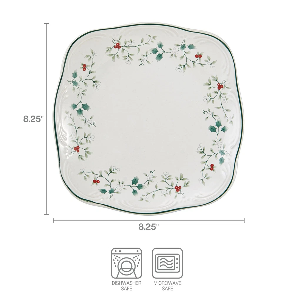 As fall turns to winter, bright holly berries make their appearance. Winterberry dinnerware by Pfaltzgraff is the holiday classic that brings this timeless motif to life in elegantly sculpted dinnerware and serveware, beautiful glassware, and joyous giftware. Perfect for casual entertaining throughout the holiday season, these white salad plates are made of durable stoneware and combine contemporary square shapes with classic design. Scalloped edges are highlighted with festive green trim, and the plates are framed with a Winterberry garland, adding seasonal charm to your tabletop display. Set of 4 salad plates, each measuring 8-1/4 x 8-1/4 inches. Microwave and dishwasher safe. . SEASONAL SALAD PLATES: white plates are framed with a Winterberry garland, adding holiday charm to your tabletop display CLASSIC MEETS CONTEMPORARY: square plates feature traditional scalloped edges with festive green trim SET OF 4: each plate measures 8-1/4 x 8-1/4 inches DURABLY MADE: crafted of stoneware for long-lasting quality EASY REHEATING AND CARE: microwave and dishwasher safe