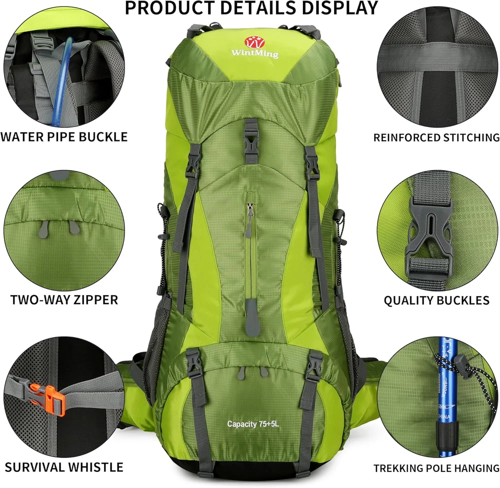 【Large Capacity Camping Backpack】Main pocket of travel daypack pack closing drawstring design, there is a compartment in the main pocket for water bladder. Multi-compartments design are to help you organize things. Travel backpack with shoe warehouse only 3.1 pounds, suitable for 3 or 4 days trips. 【Decentralized Pressure】Waist belt system of backpacking backpack is easy to tighten in high loads to disperse the weight of the shoulders to the waist and hips. Chest strap with whistle buckle makes the hiking bag more fit. The trekking backpack has been repeatedly tested and improved, great for hiking, cycling, backpacking. 【Waterproof Hiking Pack】The 75L hiking daypack size is 30*10*12 inch, camping bag made of waterproof nylon material, high quality and smooth zippers, backpacker backpack with rain coveron bottom pocket can protect your stuff from the heavy rain, multi-functional hiking backpacking packs for men and women. 【High Performance】Camping backpack for men with multiple attachment straps for tie up tents, mat, hammock, sleeping bags etc. compression straps make the hiking backpack men compact and easy to carry, a great outdoor backpack for climbing, hiking, camping, backpacking, trekking, traveling. 【Comfortable & Breathable】Mountaintop hiking backpack with breathable supportive back panel designed, your back feel pretty comfortable when you carry the hiking camping rucksack for a long time. Widened and thickened S-type shoulder straps with plentiful sponge padding help relieve the stress Product Description Hiking has become more and more popular with young people, adding color to your holidays and weekends. This 75L backpacking backpack is designed for hiking and camping expeditions that enough strong and room to bear and accommodate sufficient necessities for every outdoor enthusiasts. - High-abrasion fabric makes it easy for you to pack hiking essentials stuff without worrying about jam-packing your backpack to the brim and ruining it. - Ultralight, only 1.4kg, reducing the backpack loading weight so that you can carry more other items. - The hiking backpack meet size requirements for most airlines, enough room for 3 or 4 days trips, convenient for the hiking, climbing, camping enthusiasts. - The backpack provides a secure, fully adjustable fit around the torso, an adjustable waist belt, and adjustable straps at the shoulders for upper-load balance and support. 75L hiking backpack Specifications Fabric: water-resistant nylon Capacity: 75L Weight: 3.1lb Size: 30 * 10 * 12 inches Comfortable Hiking Backpack for Traveling Enthusiasts This hiking backpack no frame, but designed with supportive sponge back panel, easing burden, comfortable to use. This camping backpack designed with padded belt to balance the distribution of weight from your back to your hips. Widened and thickened S-type shoulder straps cooperate with chest straps help relieve the stress from your shoulder. Through multiple tests and repeated improvements, ergonomic design ensuring you enjoy your hike without discomfort.