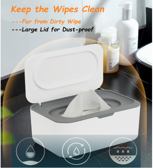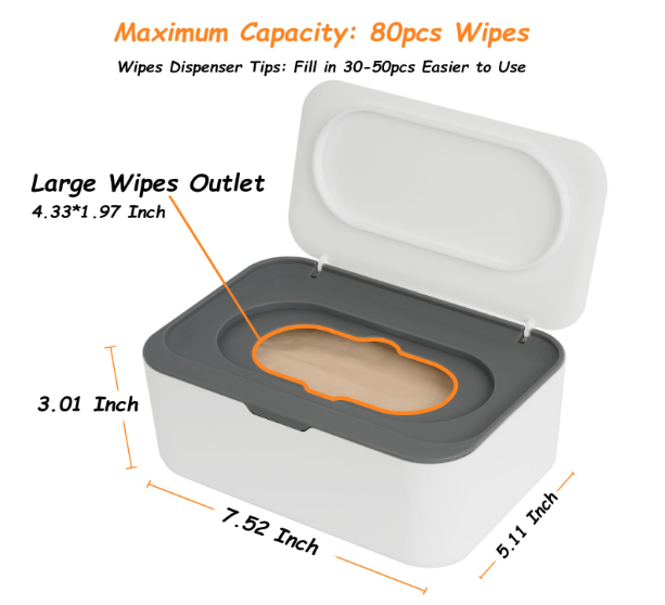 Wipes Dispenser, Wipe Holder for Baby & Adult, Seposeve Refillable Baby Wipe Container, Keeps Wipes Clean. Non-Slip, Easy Pull Wipes Pouch Case, Grey Far from Dirty Wipe: Baby wipes easily get dirty by dust and other spoils after unboxing, Seposeve wipe holder can effectively help you to avoid this problem. Effectively keeps the wipe clean, away from dust and stains. Life-safer for parents. Keep the Wipes Clean: Seposeve uses a dust cover lid and silicone ring inside the wipe dispenser which keeps the wipes clean in wipe dispenser. Easy to Pull Wipes: The Large outlet size: 4.33 *1.97 inches,which is enough to reach in and pull out the wipes. Make your life more convenient. Capacity - 80 Wipes: The top concave design of the lid is suitable for placing all kinds of small life items or other baby items. Up to 7.52*5.11*3.01 inches. Recommended to fill in 30-50 pcs wipes for easier use Multi-scene Use: Indoors suitable for living room, baby nursery, bedroom, kitchen, bathroom, etc., Outdoors can be placed in a stroller organizer or diaper bag/caddy.