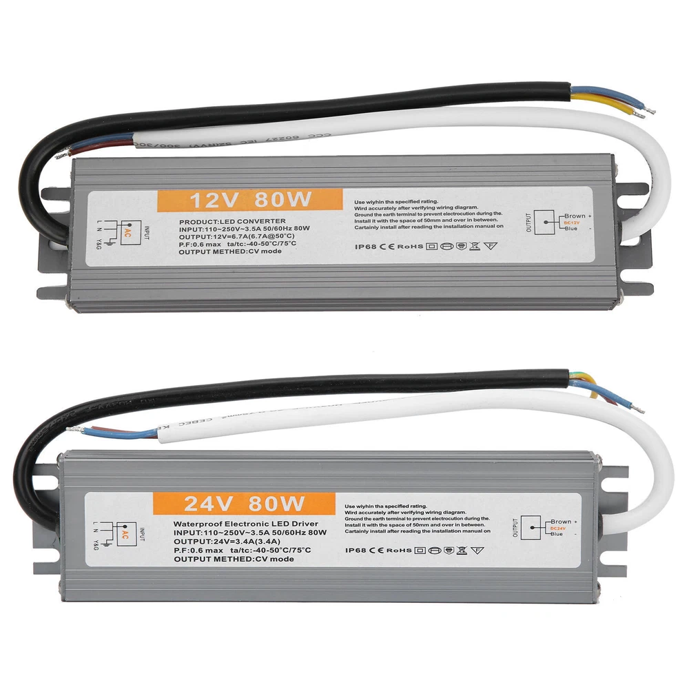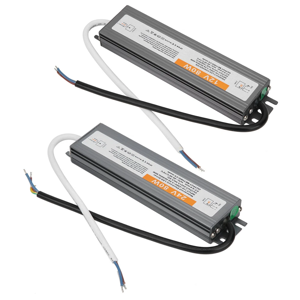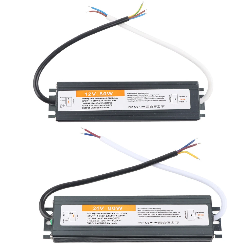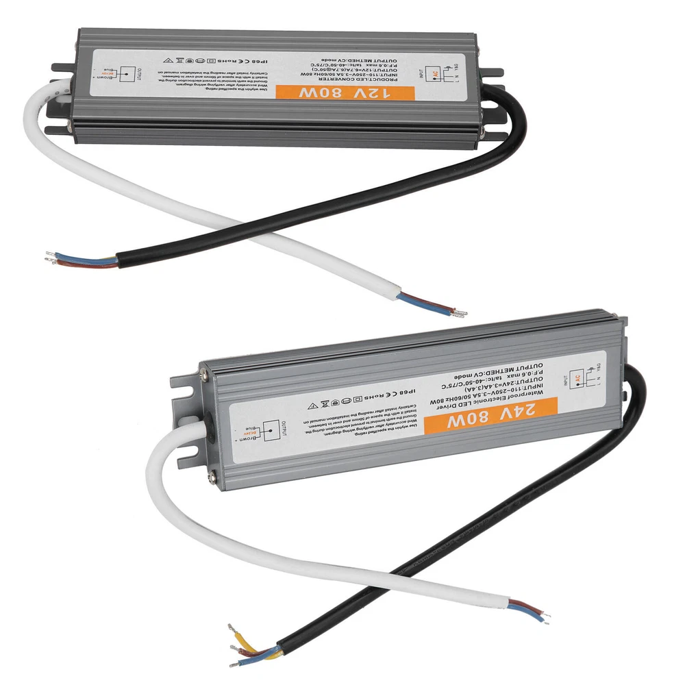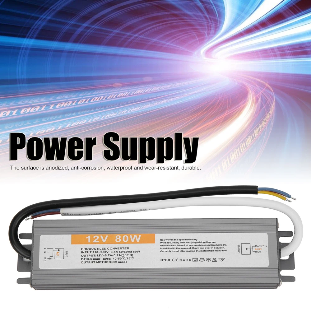 Feature: 1. IP67 ultra‑thin waterproof switching power supply, safe and reliable. 2. The surface is anodized, anti‑corrosion, waterproof and wear‑resistant, durable. 3. Low DC ripple, high efficiency. 4. Excellent insulation performance, high dielectric strength. 5. High efficiency, long life, high reliability. Specification: Condition: brand new Item type: LED Waterproof Power Supply Material: aluminium alloy Color: As picture shown Model: 80W Output power: 80W Input voltage: AC110-250V (50/60HZ) Protection level: IP67 Output voltage accuracy: 98 (%) Output ripple noise: 100mVp-p Installation method: wiring type Package List: 1 x LED Waterproof Power Supply