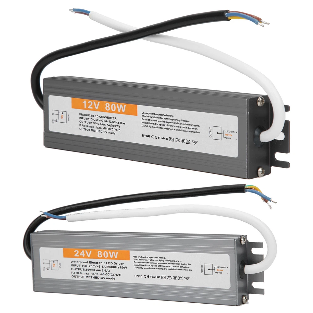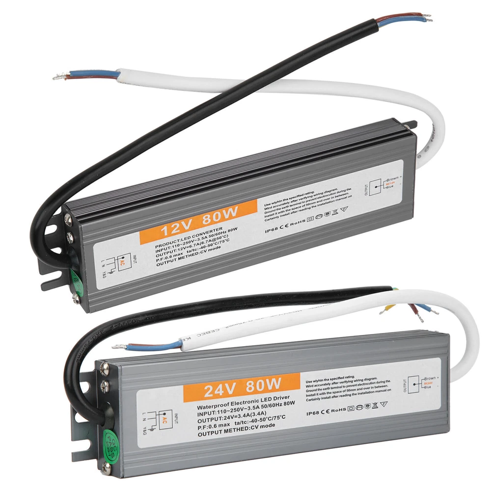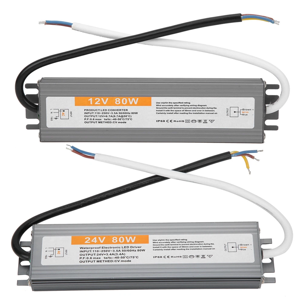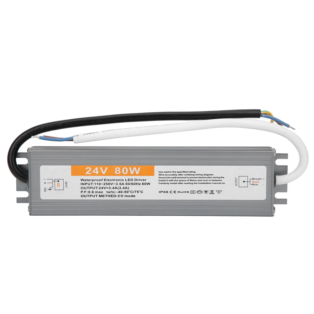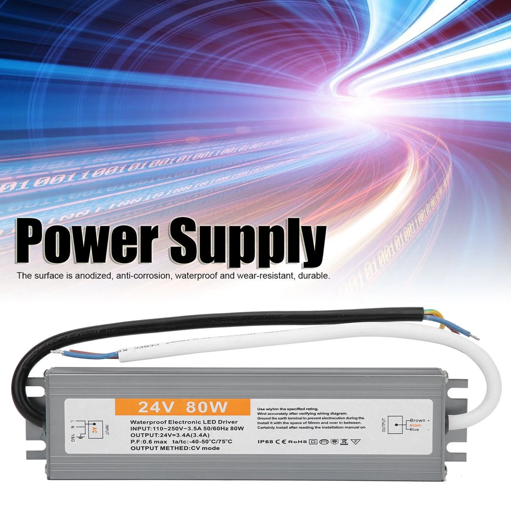 Feature: 1. IP67 ultra‑thin waterproof switching power supply, safe and reliable. 2. The surface is anodized, anti‑corrosion, waterproof and wear‑resistant, durable. 3. Low DC ripple, high efficiency. 4. Excellent insulation performance, high dielectric strength. 5. High efficiency, long life, high reliability. Specification: Condition: brand new Item type: LED Waterproof Power Supply Material: aluminium alloy Color: As picture shown Model: 80W Output power: 80W Input voltage: AC110-250V (50/60HZ) Protection level: IP67 Output voltage accuracy: 98 (%) Output ripple noise: 100mVp-p Installation method: wiring type Package List: 1 x LED Waterproof Power Supply