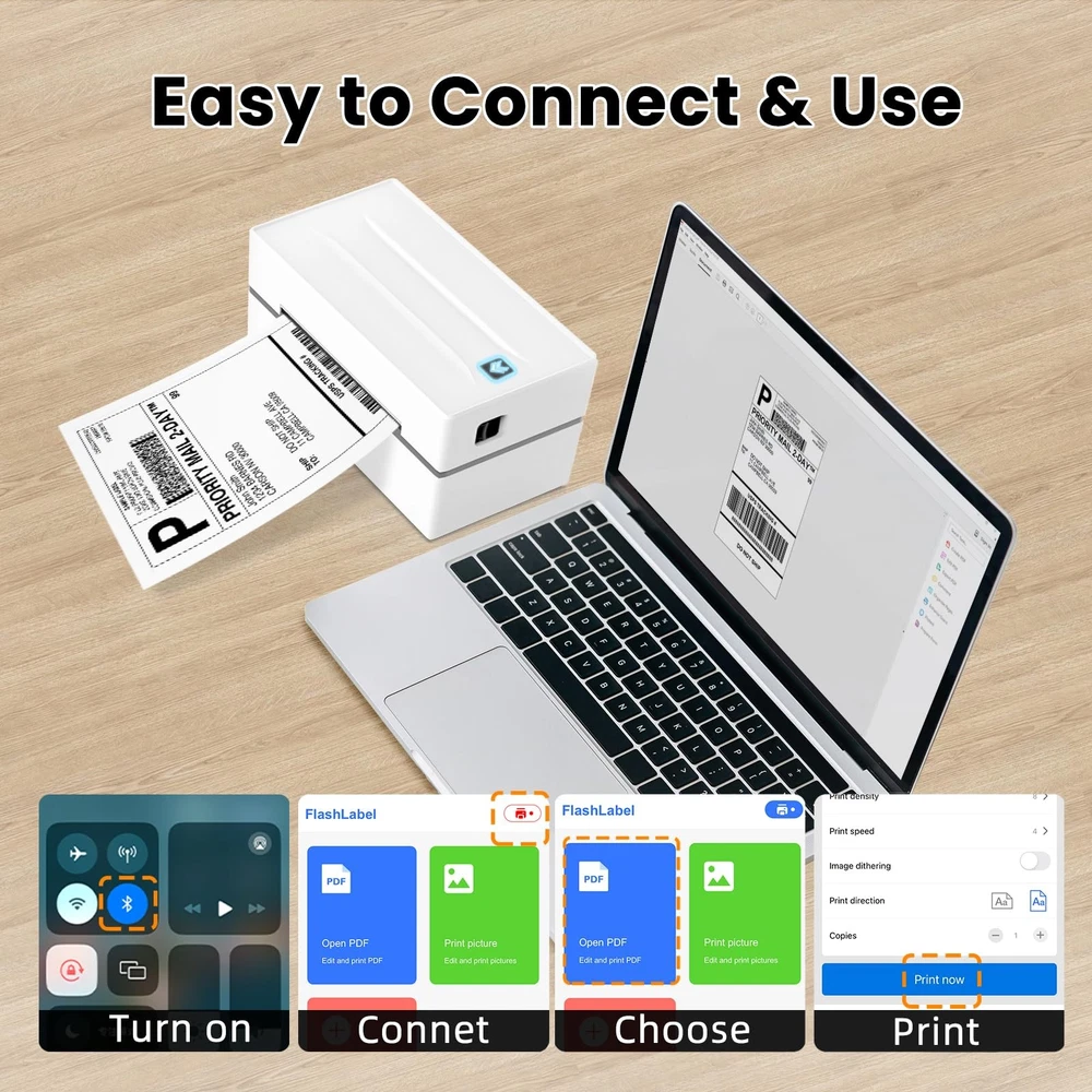 Bluetooth Thermal Shipping Label Printer, Wireless 4x6 Shipping Label Sticker Printer for Small Business and Office, Compatible with Android&ios Windows, Used for Amazon, Shopify, Etsy ๐๐น๐๐ฒ๐๐ผ๐ผ๐๐ต ๐ช๐ถ๐ฟ๐ฒ๐น๐ฒ๐๐ ๐๐๐๐๐ฅ ๐ฃ๐ฟ๐ถ๐ป๐๐ฒ๐ฟ - The Y812 label printer allows you to print labels anytime, with support for Bluetooth connectivity to both iOS and Android systems. Simply download the app "FlashLabel" for quick and easy label printing with this bluetooth label printer. ๐ฆ๐๐ฝ๐ฝ๐ผ๐ฟ๐๐ ๐ฎ๐น๐น ๐ ๐ฎ๐ท๐ผ๐ฟ ๐ฆ๐ต๐ถ๐ฝ๐ฝ๐ถ๐ป๐ด ๐ฃ๐น๐ฎ๐๐ณ๐ผ๐ฟ๐บ๐ - shipping label printer is compatible with major shipping platforms like FedEx, UPS, USPS and more, as well as marketplaces including Amazon, Shopify, Etsy, and eBay. (4"x6" thermal labels are recommended.) ๐๐ถ๐ด๐ต ๐ฆ๐ฝ๐ฒ๐ฒ๐ฑ ๐ฎ๐ป๐ฑ ๐๐น๐ฒ๐ฎ๐ฟ ๐ฃ๐ฟ๐ถ๐ป๐๐ถ๐ป๐ด - The Y812 thermal label printer uses direct technology thermal printing and doesnโt require expensive ink, toner, or ribbons. With 180mm/s fast printing speed, address label printers can print nearly 72 pages/min. And with 203DPI and Japanese print head, every details of the labels printed by this wireless label printer could be scanned and read efficiently. Save money and time for your business. ๐ฃ๐ฟ๐ถ๐ป๐ ๐ฉ๐ถ๐ฎ ๐จ๐ฆ๐ - For Windows (7 and later), Mac OS, and Chrome OS, simply connect the desktop label printer using a USB cable. Please note that Mac OS exclusively operates through USB connection, Bluetooth printing is not supported. ๐๐ฎ๐ฏ๐ฒ๐น ๐๐ผ๐บ๐ฝ๐ฎ๐๐ถ๐ฏ๐ถ๐น๐ถ๐๐ ๐ฎ๐ป๐ฑ ๐ฆ๐ฎ๐น๐ฒ ๐ฆ๐ฒ๐ฟ๐๐ถ๐ฐ๐ฒ - The 4x6 label printer supports thermal labels with a width of 1.57" to 4.3", such as 4"x 6" shipping labels. Customer service team is available to assist you via online chat, email, remote-desktop, ensuring one-minute setup and easy operation. Customers can rely on lifetime technical support and a 12-month for peace of mind and continuous assistance. ๐๐ป๐๐๐ฎ๐น๐น๐ฎ๐๐ถ๐ผ๐ป ๐ฎ๐ป๐ฑ ๐ฆ๐ฒ๐๐๐ถ๐ป๐ด - Follow the steps in the video instruction in the detail page, or follow the steps outlined in the manual instruction. Please feel free to contact us if you have any problems during the installation process.