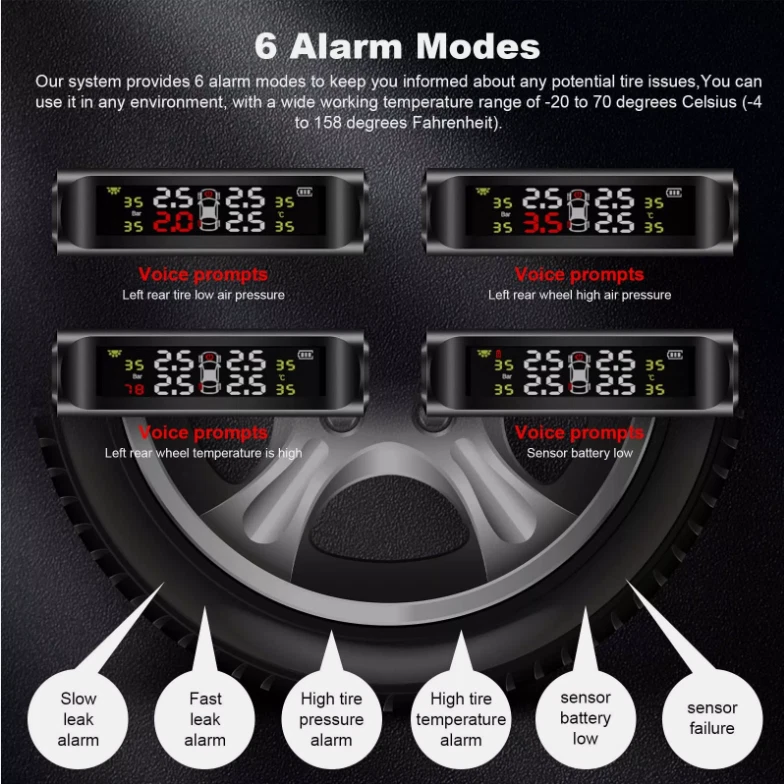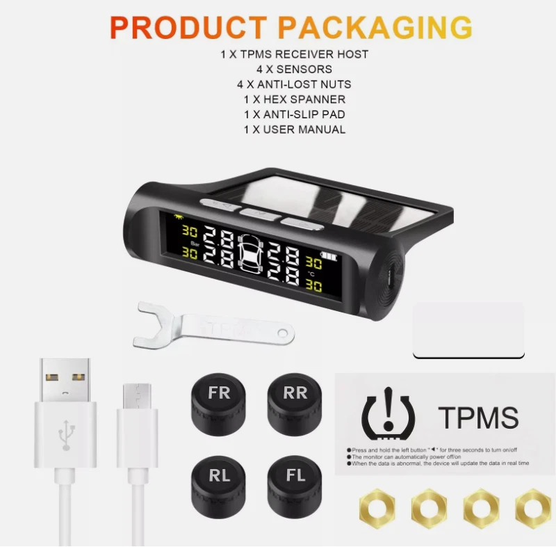 Product Description Real-time Monitoring: The LCD display can clearly display the temperature and pressure of the tire in real time. The temperature and pressure data can be switched (default is 0- 3.5 Bar / 0-50 Psi), the temperature unit ℉ / °C / Bar and the pressure unit: PSI / Bar are optional. Solar Power & USB Charging: Support solar power charging and USB cable charging, do not occupy the car cigarette lighter socket,ensure that the TPMS can work continuously, You don't need to worry about low battery. Intelligent Voice Alarm: When the tire temperature or pressure is abnormal, TPMS will give voice Alarm to broadcast tire problem immediately, you don’t need to stare at the monitor screen to confirm tire problems, Press any button will stop alarming, it is more convenient and safe. Intelligent on and off: It has vibration sensing, After the tire pressure monitoring system is opened, If the tire pressure monitor sensor does not detect vibration, the display will automatically enter sleep mode to save power, it will automatically turn on when the car vibrating. After manually shutting down, you need to manually start it. 4 External Waterproof Sensors: 4 IP68 sensors can be waterproof, dustproof and snowproof, anti-corrosion,good accuracy for measure temperature and pressure, monitor the temperature and pressure of the tires for you, ensure the safety of the driver, and extend the service life of the tires. Specification: Display screen:LCD Operating temperature: -30°C-85°C Working voltage: 3.7-5V Daytime operating current/Night operating current/Standby current:<20mA/<4mA/<50uA Transmission frequency:433.92MHZ+/-20KHZ Transmission mode:FSK Pressure unit: BAR/PSI Charging ways:Solar energy/USB Battery:1*303450 3.7V 500mAh Sensor: Operating temperature: -30°C-85°C Working voltage: 3.7-5V Standby current:<1uA Transmission frequency: 433.92MHZ+/-20KHZ Transmitted power:>8dBm Open Distance:>30M Battery(each sensor):1*CR1632 3V Monitor size: Approx.9.5*8.5cm Sensor size(each): Approx.2*2*2cm Package Included: 1 TPMS Receiver host 4 Sensors 4 Anti-lost nuts 1 Hex spanner 1 Anti-slip Pad 1 User manual Fit for Ford Fusion Ford Escape etc 20PCS M12x1.5 19 mm Wheel Lug Nuts 13.99 USD Free shipping Carburetor Carb Assy For Yamaha A iPower SC2000i 2000/1600 W Inverter Generator 14.99 USD Free shipping 60" Inch Truck Tailgate LED Light Bar Brake Reverse Turn Signal Stop Tail Strip 12.99 USD Free shipping Electric Oil Transfer Pump Extractor Fast Change Transmission Fluid Extractor 17.99 USD Free shipping 2 x Copper Nickel Brake Line Tubing Kit 3/16 OD 25 FT Coil Roll All Size Fitting 19.0 USD 22.35 USD Free shipping 15% off 3.5V-36V Digital Automotive Car Power Circuit Electrical Tester Probe Test Light 16.88 USD 19.99 USD Free shipping 16% off powered by