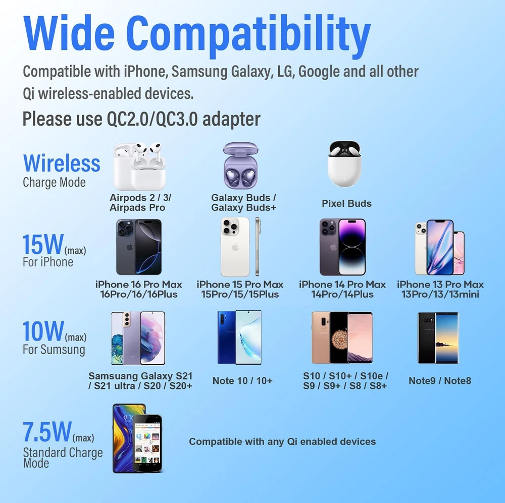Store New Arrivals Add to Favorite View Feedback Contact Fast deliveries to the customer's home Quality customer service John Make the customers happy! Wireless Charger, Wireless Charging Pad Compatible with Iphone 16 15 14 13 12 11 Pro Max/Mini/Plus/Xr, 15W Max Fast Wireless Charging Pad Mat for Samsung Galaxy S23/S22/S21/S20/S10, Airpods Pro/3/2 Description 【Extensive Compatibility】 15W fast charging mode for iPhone 16 15 14 13 12 Series/ Pro/ Pro Max/ mini/ SE 2020/11/11 Pro/11 Pro Max/X/XS/XS Max/XR/8/8+; 10W fast charging mode for S23/S22/S21/S20/S20+/Note 20/10/10+/S10/S10+/ S10E/ Note 9 and more; 7.5W standard charging mode for all other wireless-enabled Phones. (Note: Adapter is Not Included, QC3.0 adapter is needed for fast charge.) 【Multiple Safty Protection】 Built-in highly efficient components and intelligent chip, 15W fast charging stand provided with exclusive multiple advanced charging protection technologies, like temperature control, over-current protection, over-voltage protection and over-charging protection. Therefover wireless charger will never bother your sleep that you can have a good dream. 【Ultra thin & Portable】 Wireless charging pad is just 6.5mm super slim make it easier to put it in your pocket, more easier to be carried on anywhere.Type-c cables (included) allows wireless charger to charge in a faster rate. 【Smart Indicator Light Design 】 LED indicator of the fast wireless charging station helps you know charging status easily. Blue LED indicates your phone is in charging and the green LED indicates charging finished. The cyan lights flickered, indicating that the mobile phone and headphones are charged normally. Soft and unobtrusive light, suitable for bedside use. 【What You Get】1X Wireless Charger Pad, 1X Type-C USB Charging Cable, 1X User Manual.You can consult us if you encounter any problems, We provide a 24-hour customer service. An ideal Present - As a perfect Christmas gift, Secret Santa present, New Year gift, or birthday present for him or her, your family, friends, and someone you love. Product Description Total Usb Ports 1 Number of Items 1 Power Source AC Connector Type Used on Cable USB Type C Main Power Connector Type 2 Pin Number of Power Levels 1 Model Number PC-15W-USB-C Input Voltage 5 Volts Energy Specifications Met Qi Additional Features Charging Indicator Output Current 3 Amps Connector Type USB Type C Connectivity Technology USB Power Plug Type A - 2 pin (North American) Special Feature Charging Indicator Compatible Phone Models function(f) {var _np=(window.P._namespace("DetailPageProductOverviewTemplatesJava"));if(_np.guardFatal){_np.guardFatal(f)(_np);}else{f(_np);}}(function(P) { P.when('A').execute(function(A){ A.on('a:truncate:po-attribute-truncate-4:updated', function(data) { var isTruncated = !data.truncateInstance.getIfTextFits(); var seeMoreElement = document.getElementById('po-attribute-see-more-id-4'); if(seeMoreElement) { seeMoreElement.style.display = isTruncated ? '' : 'none'; } }) }); })); iPhone 16, iPhone 15, iPhone 14 Plus, iPhone 14 Pro, iPhone 14 Pro Max, iPhone 13 Pro Max, iPhone 13 Pro, iPhone 13, iPhone 13 mini, iPhone 12 Pro Max, iPhone 12 Pro, iPhone 12, iPhone 12 mini, iPhone 11 Pro Max, iPhone 11 Pro, iPhone 11, iPhone SE, iPhone XS MAX, iPhone XS, iPhone XR, iPhone X, iPhone 8 Plus, iPhone 8, Airpods 2/3, Airpods Pro/Pro2 See more Mount Type Tabletop Mount Amperage 3 Amps Portable Yes Mounting Type Tabletop Mount Color Black Wattage 15 watts Compatible Devices function(f) {var _np=(window.P._namespace("DetailPageProductOverviewTemplatesJava"));if(_np.guardFatal){_np.guardFatal(f)(_np);}else{f(_np);}}(function(P) { P.when('A').execute(function(A){ A.on('a:truncate:po-attribute-truncate-3:updated', function(data) { var isTruncated = !data.truncateInstance.getIfTextFits(); var seeMoreElement = document.getElementById('po-attribute-see-more-id-3'); if(seeMoreElement) { seeMoreElement.style.display = isTruncated ? '' : 'none'; } }) }); })); iPhone 16, iPhone 15, iPhone 14 Plus, iPhone 14 Pro, iPhone 14 Pro Max, iPhone 13 Pro Max, iPhone 13 Pro, iPhone 13, iPhone 13 mini, iPhone 12 Pro Max, iPhone 12 Pro, iPhone 12, iPhone 12 mini, iPhone 11 Pro Max, iPhone 11 Pro, iPhone 11, iPhone SE, iPhone XS MAX, iPhone XS, iPhone XR, iPhone X, iPhone 8 Plus, iPhone 8, Airpods 2/3, Airpods Pro/Pro2 See more Output Voltage 5 Volts Built-In Media Wireless Charging Pad, Type-C USB Charging Cable, User Manual Included Components Wireless Charging Pad, Type-C USB Charging Cable, User Manual ABOUT US We offer the best prices around on high quality products. Our E-store includes media such as books, movies, music and games while offering electronics, toys, sporting apparel, clothing, tools, general home, garden items and more. SHIPPING We are always working hard to ensure your package arrives as soon as possible. Please understand that some factors like weather, high postal traffic, and the performance of shipping companies are outside of our control. We offer free shipping to the lower 48 states and ship within 2 business days of payment, usually sooner. We do not accept P.O. Boxes. Please provide a physical address. For shipping outside of the continental USA, we only use eBay's Global Shipping Program. The item is shipped to KY and then sent to the rest of the world. International customers are responsible for all duties and taxes. Continue to 'check out' to calculate costs for shipping the item to your country. Messages regarding eBay's Global Shipping Program MUST be directed at eBay EXCLUSIVELY. RETURNS We offer a 30-Day Return Policy on items in which you are not completely satisfied with. You have the option of a full-refund or an exchange of the item. No returns are available on items shipped outside of the USA PAYMENT We accept PayPal. CONTACT US This page content is yet to come Please ad us to your favorite seller and visit again later Thank You CUSTOMER SATISFACTION We try our very best to make sure 