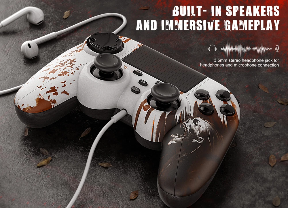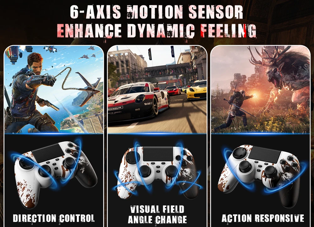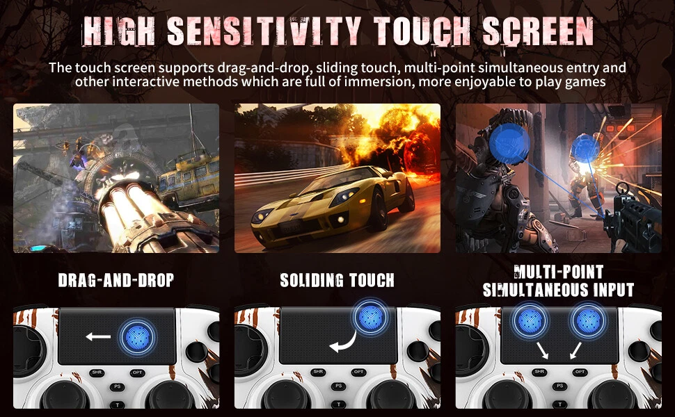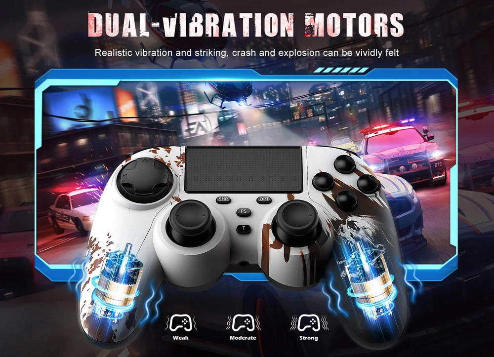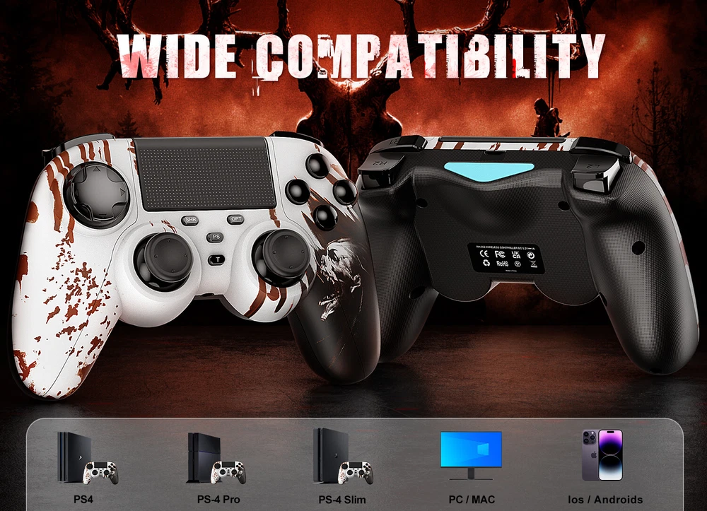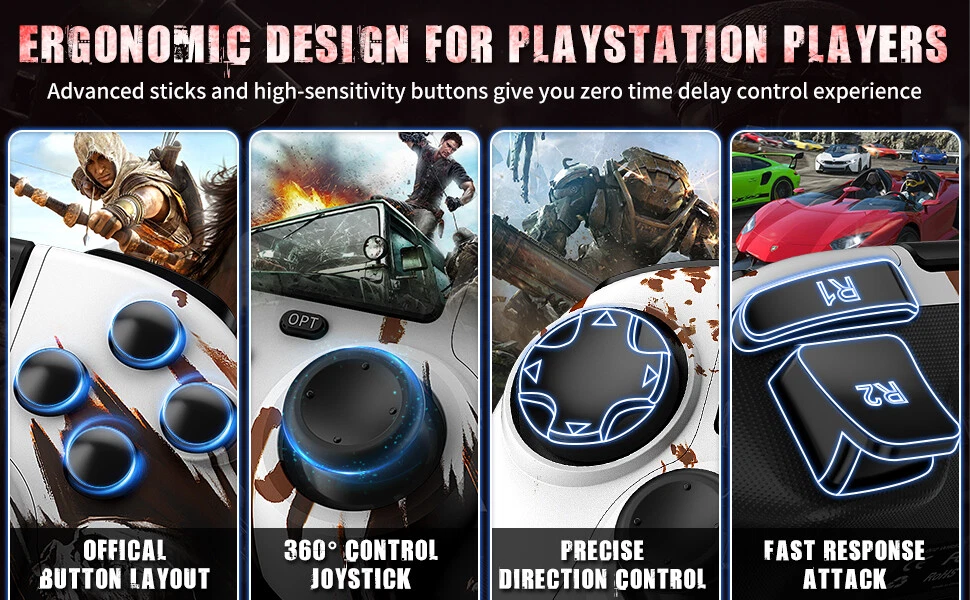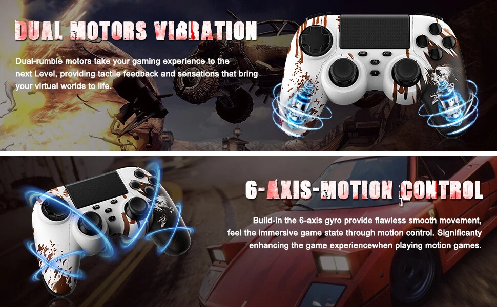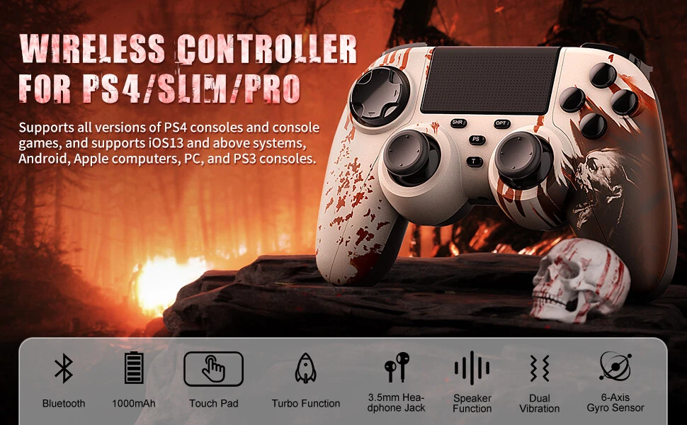 This wireless controller can perfectly support all versions of p4 consoles and console games, but also suitable for PC with Windows 7 and above systems and iOS 13/Android 5.0 and above phone. Controller has a built-in 1000 mah lithium battery, charged for 2hours, and can provide 12 hours of game life. controller can be used through wired or bluetooth wireless connection, and the bluetooth transmission distance can reach more than 10m,Fast and stable without delay. Controller comes with a 3.5mm stereo audio headphone port for connecting headphones and microphones. The built-in six-axis sensor can accurately sense the tilt angle of the handle and the acceleration information in three-dimensional space. Dual vibration motors provide more realistic gaming feedback. Description: Supporting platform: P4 all series/Android/IOS/Windows 7 and above Connection method: Bluetooth/Type c wired Product net weight: 270g Battery capacity: 1000mAh Charging voltage: DC 5V Use distance: 10 meters Packing List: 1x P4 Controller 1x Type c data cable 1x User manual 🎮【Multi-Platform Compatible】The Game Controller Compatible with P4/Slim/Pro Console/ PC windows 7/8/8.1/10/IOS 13 /Android 10 /MAC,Compatible P3 can only support wired connection (Note: you need to activate device with the USB cable in the package for the first connection.) 🎮【Precise Control & Turbo】 Game pad supports Turbo function, first press and hold the T/SHARE key, then press any function key, then the function key has Turbo burst function. The buttons are with high sensitivity and provide an accurate gaming experience. The analog sticks and trigger buttons are responsive and smooth, which are almost no input lag and drift. 🎮【Ergonomics Design】The asymmetrical grip and contour design of the joystick perfectly fits your hands, delivering a supper comfy holding. The custom for P4 controllers deliver high sensitivity and fast response overall performance, all buttons are easy to press and respond immediately, with good tactile feedback for maximum comfort and endless gaming experience. 🎮【Dual Vibration Feedback & Gyro Sensor】: The controller built-in dual Vibration motors and 6-axis gyroscope make the game more realistic for p4 game player and enables you feel every hit, crash, and explosion with hand-vibrating double shock response. 🎮【Wireless Connection&Strong Battery Life】The movement accuracy, feel, shape and sensitivity of the p4 gamepads analog sticks and trigger buttons have been enhanced, better grip feeling fit your hands more comfortably. The 1000mAh p4 gamepad controller takes just 2.5 hours to charge and up to 10 hours of playtime. Compatible with charging docks and USB cables.