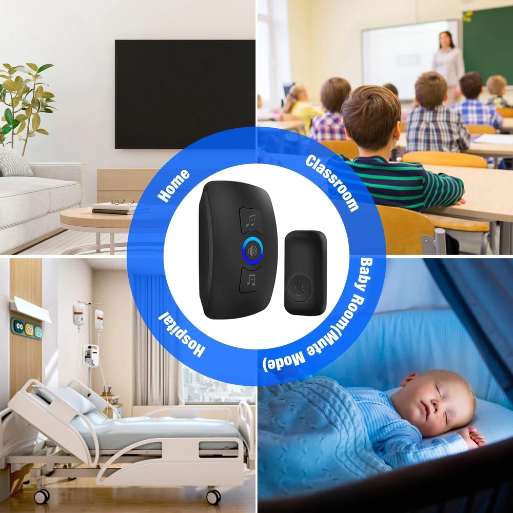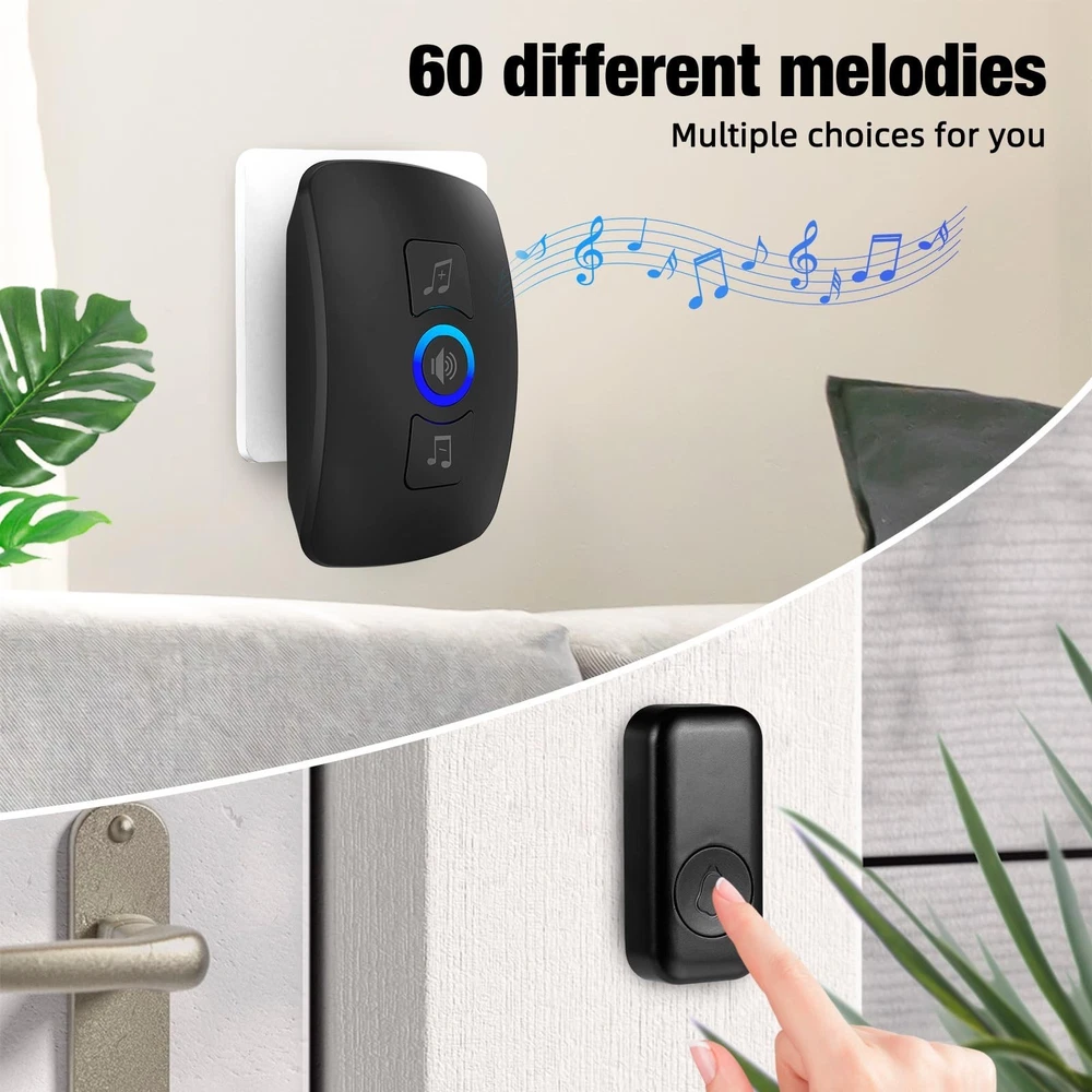 Wireless Doorbell Chime with 60 Melodies, 5 Volume Levels, LED Light, IP55 Waterproof