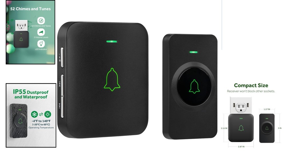 Stylish Wireless Doorbell with LED Flash - 1000ft, 52 Chimes, Waterproof Design ‹ › ‹ › ‹ › ‹ › ‹ › ‹ › ‹ › ‹ › ‹ › ‹ › Stylish Wireless Doorbell with LED Flash Enhance your home's entrance with our modern wireless doorbell designed for both style and function. Key Features: SIMPLE SETUP: Plug the mini receiver into a socket and fix the transmitter effortlessly on a wall with included accessories: 2 screws, 2 anchors, a handy key, and a piece of double-sided bonding tape. ULTRA LONG WIRELESS RANGE: Experience a remarkable 1000 feet (300 m) of wireless connectivity with a single plug-in receiver, ensuring you never miss a visitor—no matter where you are in your home. CHOICE OF 52 CHIMES: The 1.1-inch (29 mm) stereo speaker delivers rich sound. Select from 52 delightful melodies with 5 adjustable volume levels reaching up to a commanding 115 dB. HIGH-PERFORMANCE TRANSMITTER: Featuring ultra-low power consumption, a robust lithium battery with a 3- lifespan, and a durable waterproof and dustproof rating, this doorbell is designed to withstand the elements from -4 °F to 140 °F. MEMORY FUNCTION: Never worry about resetting your preferences! It remembers the last melody and volume level after a power outage, simplifying your experience. Why Choose Our Wireless Doorbell? Infuse elegance into your home while embracing convenience. Our wireless doorbell offers stylish modern design while ensuring reliability and ease of use. With an impressive range, multiple chimes to suit your mood, and hassle-free setup, it is the perfect addition to your entrance. Don't compromise on security and style. Elevate your home with our Stylish Wireless Doorbell today! Shipping Free & Fast Shipping - We offer free shipping to most of the USA with a normal delivery time of 3-7 days. However, due to the current situation, additional delivery time (up to 3 weeks) may be required for some items. Alternative Carriers - We may use alternative carriers (e.g. USPS, FedEx, UPS, etc.) to ensure your package arrives safely and on time. Due to the use of multiple carriers, we are unable to provide a tracking number automatically. Handling Time - Orders are processed and shipped within 1-2 business days of receiving cleared payment. Shipping Restrictions - Shipping to Alaska, Hawaii, Puerto Rico, Guam, and other US territories may incur shipping charges or delivery restrictions. Please contact us before ordering, or your order can be refunded/cancelled. State Restrictions - There may be restrictions based on your state of purchase. For example, certain items may not be shipped to California due to state regulations. Contact for Tracking Updates - If you require tracking updates or have any concerns about the delivery of your order, please feel free to contact us, and we will be happy to assist you. Return 30-Day Hassle-Free Returns - We want you to be completely satisfied with your purchase. If you are not, you can return the item within 30 days of receiving it for a full refund or exchange. Easy Return Process - To start a return, simply contact us and we will provide you with a prepaid return shipping label and detailed instructions. Restocking Fee - There are no restocking fees for returns. However, the buyer is responsible for return shipping costs if the return is not due to a seller's error. Refund Processing Time - Refunds will be processed within 5 business days of receiving the returned item in its condition. Payment We accept all major credit cards, PayPal, and Apple Pay for your convenience. Your payment information is secure and encrypted to ensure a safe and seamless transaction. Please complete your payment within 3 days of purchase to avoid any delays in shipping. Feedback Your feedback is extremely important to us. We strive to provide the best products and customer service possible. If you are satisfied with your purchase, please take a moment to leave us a positive review. If you have any concerns or issues with your order, please contact us before leaving negative feedback. We are committed to resolving any problems and ensuring your satisfaction. Contact Us If you have any questions or concerns, please feel free to out to our customer support team. You can contact us through the eBay messaging system. We are available Monday to Friday, 9:00 am to 5:00 pm EST, and we will do our best to respond to your inquiry within 24 hours. Buy it now and enjoy a pleasant shopping experience! Voltage: 3 V Unit Quantity: 5 oz Material: Plastic Features: Waterproof,Memory Function,Portable Power Source: Battery Items Included: Screws,Transmitter,Receiver,Adhesive Tape,Screwdriver,Anchors Suitable For: Home Type: Digital Connectivity: Wireless Number of Batteries: 1 Color: Black Finish: Glossy Item Weight: 5 oz Style: Modern Button Material: Plastic Button Shape: Square Shape: Square Power: 5 W