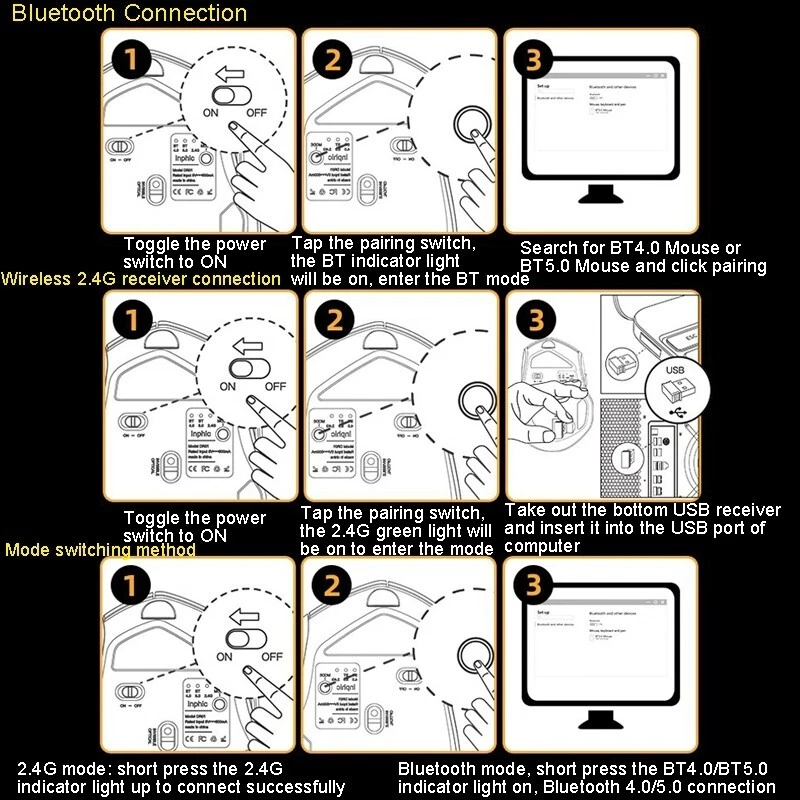 Ratón Gaming Inalambrico Modelo Inphic A9 . TBD06039568 descripcion: 1. Frecuencia del portador inalámbrico: 2402-2480MHz 2. Resolución: 800/1200/1600/2000/2400DPI 3. Capacidad de la batería incorporada: 300 mAh 4. Número de llaves: 6 llaves 5. Conexión: inalámbrica 2,4G (receptor USB) + Bluetooth 5,0/4,0 6. Entrada de carga: 5V 500mA 7. Corriente de trabajo nominal: dentro de 8 mA 8. Rendimiento del Chip: fase original 3212 9. Sistema operativo: Windows XP y series superiores, aplicable al sistema de mouse universal (el sistema WIN7 y los siguientes solo admiten conexión de receptor inalámbrico de 2,4G y no se pueden conectar al mismo tiempo a otro sistema WIN7 y los siguientes dispositivos) 10. Tamaño: aproximadamente 11,8x7,9x4cm 11. Peso: aproximadamente 100g Características: 1. Luz indicadora de energía cargada, con puntas de batería baja 2. 3 modos de conexión, se pueden utilizar varios dispositivos 3. Ambos lados de la bandeja para los dedos para brindar soporte a los dedos, faldón lateral antideslizante, cerca de la curva de la mano, sensación cómoda 4. Baterías de polímero, con tecnología inteligente de ahorro de energía, sin necesidad de reemplazar repetidamente la batería, protección del medio ambiente y tranquilidad. 5. 800-1200-1600-2000-2400 conmutación libre de DPI de cinco segmentos, respuesta y funcionamiento fluido 6. 6 botones y funciones auxiliares para mejorar la eficiencia de la oficina 7. Puerto de carga tipo C, universal y rápido 8. Botones izquierdo y derecho con diseño de botón silencioso, ruedas antideslizantes, marco interno liviano 9. Múltiples mecanismos de protección, protección contra sobrecorriente/sobretensión/sobrecarga/sobretemperatura/cortocircuito/potencia, etc., para garantizar la seguridad y confiabilidad en el proceso de uso. Método de conexión: 1. Conexión Bluetooth: -Cambie el interruptor de encendido a ON - Toque el interruptor de código, la luz indicadora de BT se encenderá, ingrese al modo de emparejamiento de Bluetooth - Busque BT4.0 Mouse o BT5.0 Mouse y haga clic en emparejar 2. Conexión del receptor inalámbrico 2,4G: - Mueva el interruptor de encendido a ON - Toque el interruptor de emparejamiento, la luz verde de 2,4G se enciende para ingresar al modo de emparejamiento - Retire el receptor USB inferior e insértelo en el puerto USB de su computadora 3. Método de cambio de modo: - Modo 2,4G: presione brevemente la luz indicadora de 2,4G para conectarse correctamente - Modo Bluetooth, presione brevemente el indicador BT4.0/BT5.0 para encenderlo, conexión Bluetooth 4.0/5.0 Especificación: Peso del paquete Peso de un paquete 0.22kgs / 0.48lb Tamaño de un solo producto 15cm * 10cm * 5cm / 5.91inch * 3.94inch * 1.97inch