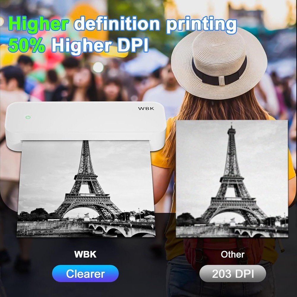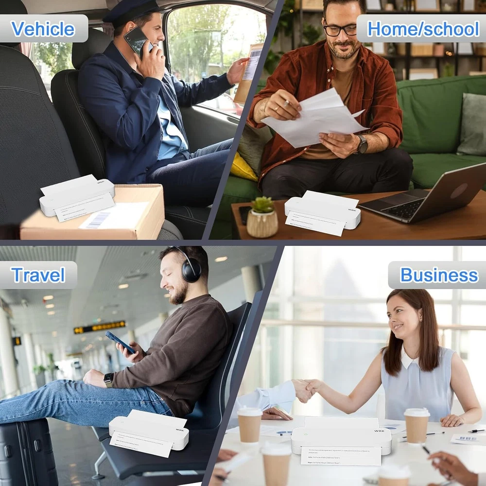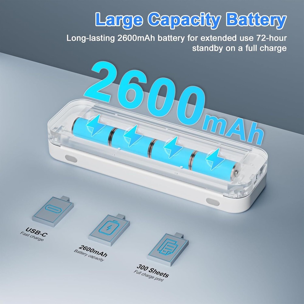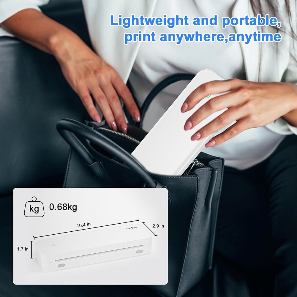 About this item (Travel-Friendly Printer) This sleek, lightweight portable wireless printer is designed for travel, weighing just 1.4 pounds and roughly the size of two smartphones. Easily slip it into your briefcase or backpack for printing anytime, anywhere during trips, business outings, office use, school activities, or even in your car. It also makes a perfect gift for friends and family. (Exceptional Print Quality & Durable Battery Life) Enjoy sharp and precise prints with this compact travel printer. Equipped with a 2600mAh battery, it provides up to 3 hours of uninterrupted printing and can produce up to 360 pages on a single charge. This thermal printer delivers clear photographs, images, design drafts, and text documents, ideal for busy professionals and active students alike. (Economical & Ink-Free Printing) Utilizing advanced thermal technology, this compact wireless printer requires no ink, toner, or ribbons, eliminating issues like clogging and cleaning. Simply use thermal paper for a more efficient and budget-friendly printing experience. (Note: This thermal printer is designed exclusively for thermal paper.) (Seamless Bluetooth Integration) The portable label printer connects smoothly with both iOS and Android devices via Bluetooth. It also works as a space-saving printer for laptops and desktops. For computer use, it connects through a USB cable, enabling printing on the go anytime and anywhere. Download the mobile printing app and install the necessary drivers for setup. (Compact Design & Robust Compatibility) It saves space and keeps your workspace organized, whether mobile or in a vehicle. Supports two methods for loading thermal paper and can print various document types. Compatible with multiple paper sizes, including standard letter sizes and 2", 3", and 4" thermal paper rolls. Product dimensions: 1.9 x 10.4 x 3.2 inches