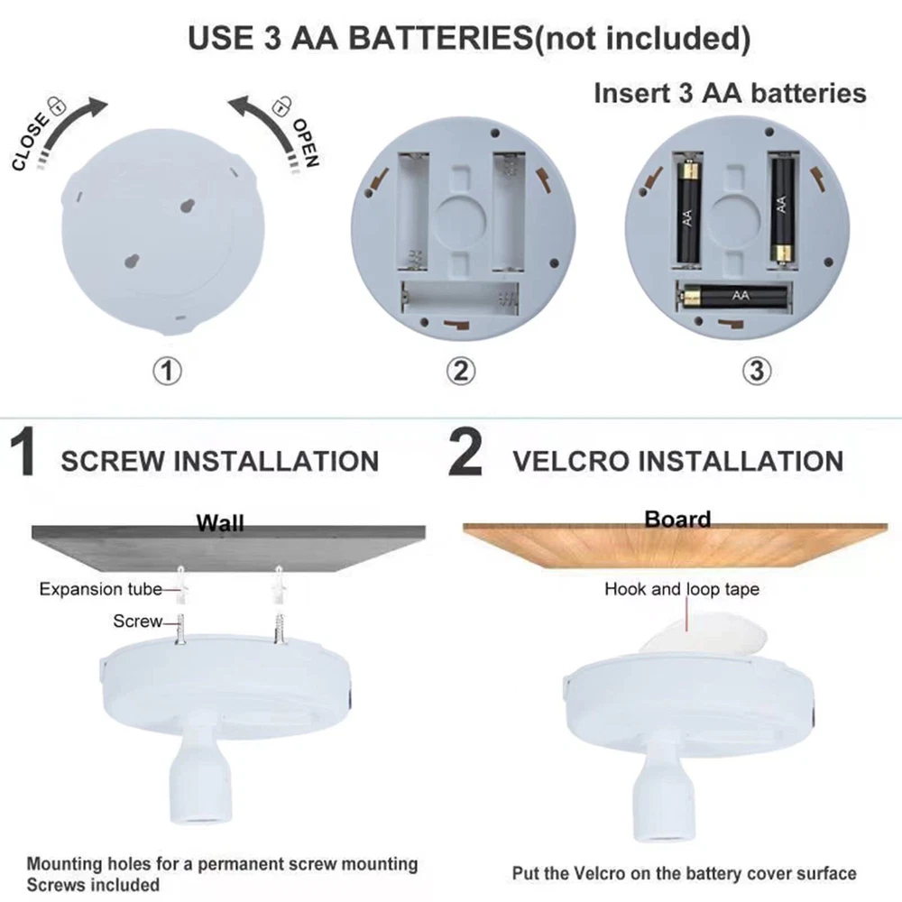 80 Lumens, Long lasting super bright LEDs, 3000K warm white light, 0.6W, DC 4.5V, lifespan is 80000 Hours. The remote control powered 1*CR2025 button cell battery. Please firstly pull out the battery insulation sheet of remote. Packing List - 2 x Spot lights - 2 x Remote - 2 x Hook and Loop Tape - 4 x Screws - 1 x User Manual 2 Pack Remote Control Battery Spotlights: You can press the light switch button to turn the light ON/OFF or use the remote, operate portable spotlight within 18 ft. When you use the remote control to turn on the light, press and hold the power "ON" for 3 seconds Multi Directional Lighting Head: LED spot lights head can swivel up and down 90°, left to right 350°, almost any direction you need it (each product dimensions: 4.1"L x 4.1"W x 2.6"H) Timer & Dimmer Presets Uplight Indoor: Remote Control ON, OFF, Timer (15/30/60/120 minutes) & Dimmer (increase brightness, decrease brightness) Wireless Battery Operated Picture Lights: The artwork lighting is powered by 3 AA batteries (not included), battery run time is 40 hours for full brightness. Long lasting super bright LEDs, 80 Lumens, 3000K warm white light Simple to Install: Easy to install puck lights with provided hook and loop tape or screws. Can use indoor anywhere like hallway, kitchen, cabinet, closet, basement, hutch, pantry, wardrobe, bookcase, shelf, jewelry display, decorative shelf or highlight Christmas decorations, art display, painting, picture, wall photograph, artwork, statue, model, dartboard, portraits, plants