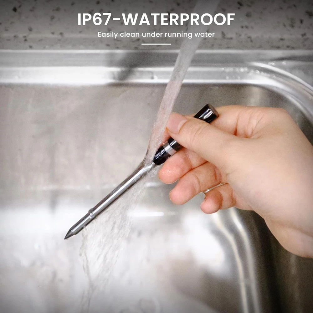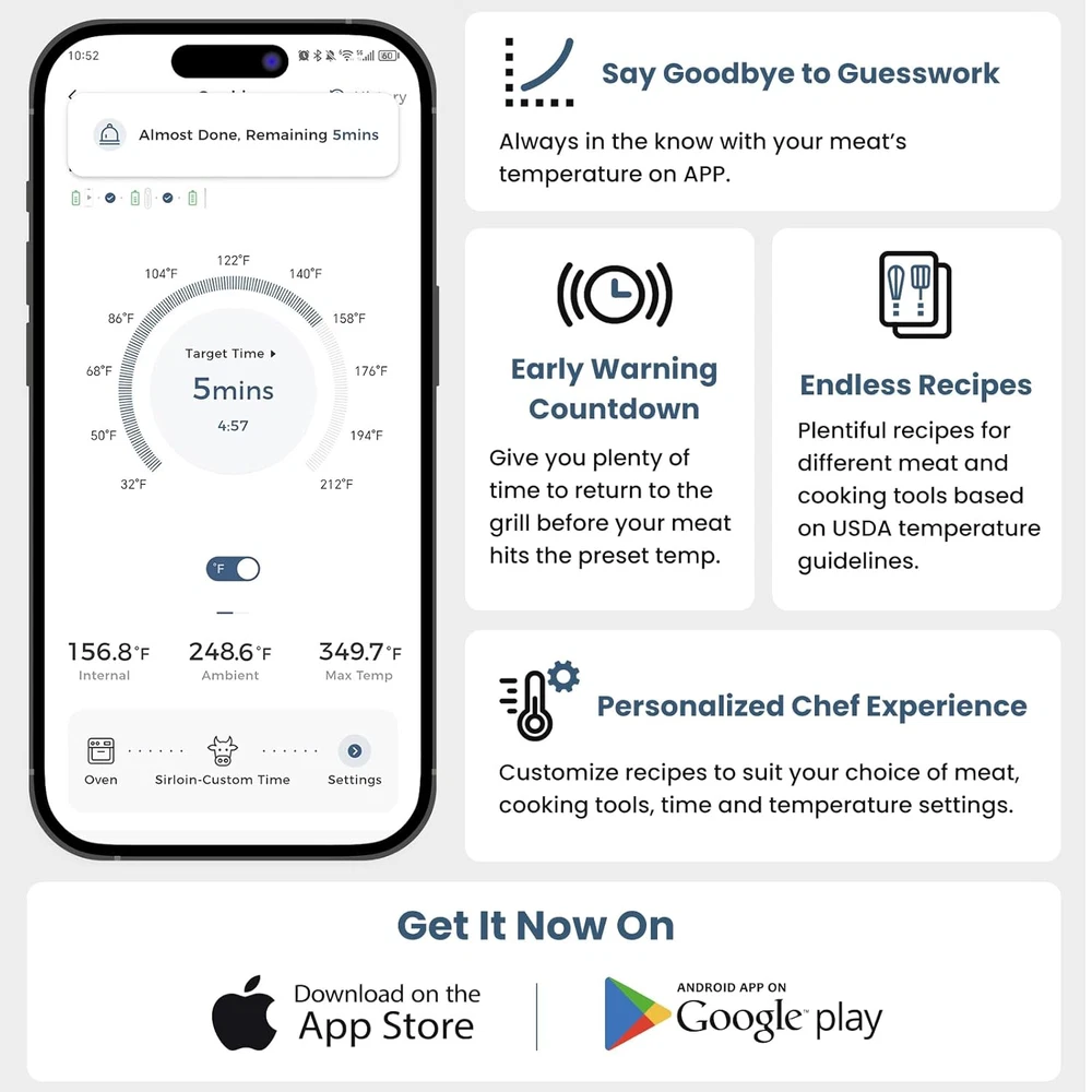 [Innovative Design and Functionality] : The CP10 wireless meat thermometer boasts a distinctive charging hub designed to resemble a time capsule, symbolizing the preservation of unforgettable culinary experiences. The wireless probe handle features a unique Four-Leaf Clover design, making it an ideal gift for anyone passionate about cooking, whether for a husband, father, wife, or friend. [Impressive 500FT Wireless Range] : With cutting-edge remote app technology, the digital wireless thermometer for smokers connects seamlessly over a remarkable 500-foot range. This allows you to monitor your cooking from a distance, providing the freedom to move around without being tied to the grill or oven. [Smarter Cooking with Dual Alarms] : The intuitive app lets you manage your cooking with ease, providing real-time temperature readings for both the meat and the cooking environment. Once the set temperature is reached, both the hub and the app trigger a dual alarm, ensuring precise cooking. Perfect for beginners, it simplifies cooking various meats like beef, turkey, pork, fish, and more. [FDA-Approved Probe with Dual Sensors] : Crafted from durable 316 stainless steel and food-grade ceramic, the thermometer features a probe with dual sensors. This allows you to simultaneously track internal temperatures up to 212°F and ambient temperatures up to 572°F, ensuring your grill or oven maintains the ideal cooking conditions. [Rapid Charging and Long Battery Life] : The hub connects via a Type-C cable for continuous use, or you can use 2 x AAA batteries for mobility. Just five minutes of charging gives you three hours of use, while two hours of charging provides more than 48 hours of operation—ideal for extended cooking sessions. The probe is IP67 waterproof, and its fast response time of 1-3 seconds ensures quick and efficient cooking, anytime and anywhere.