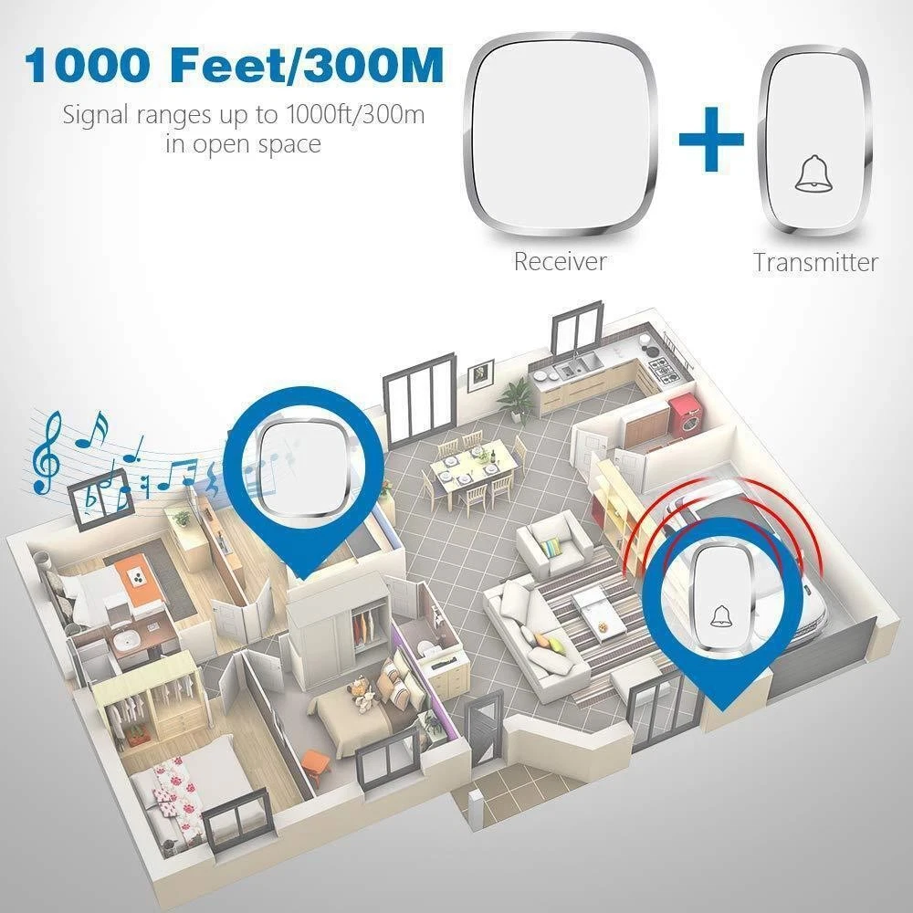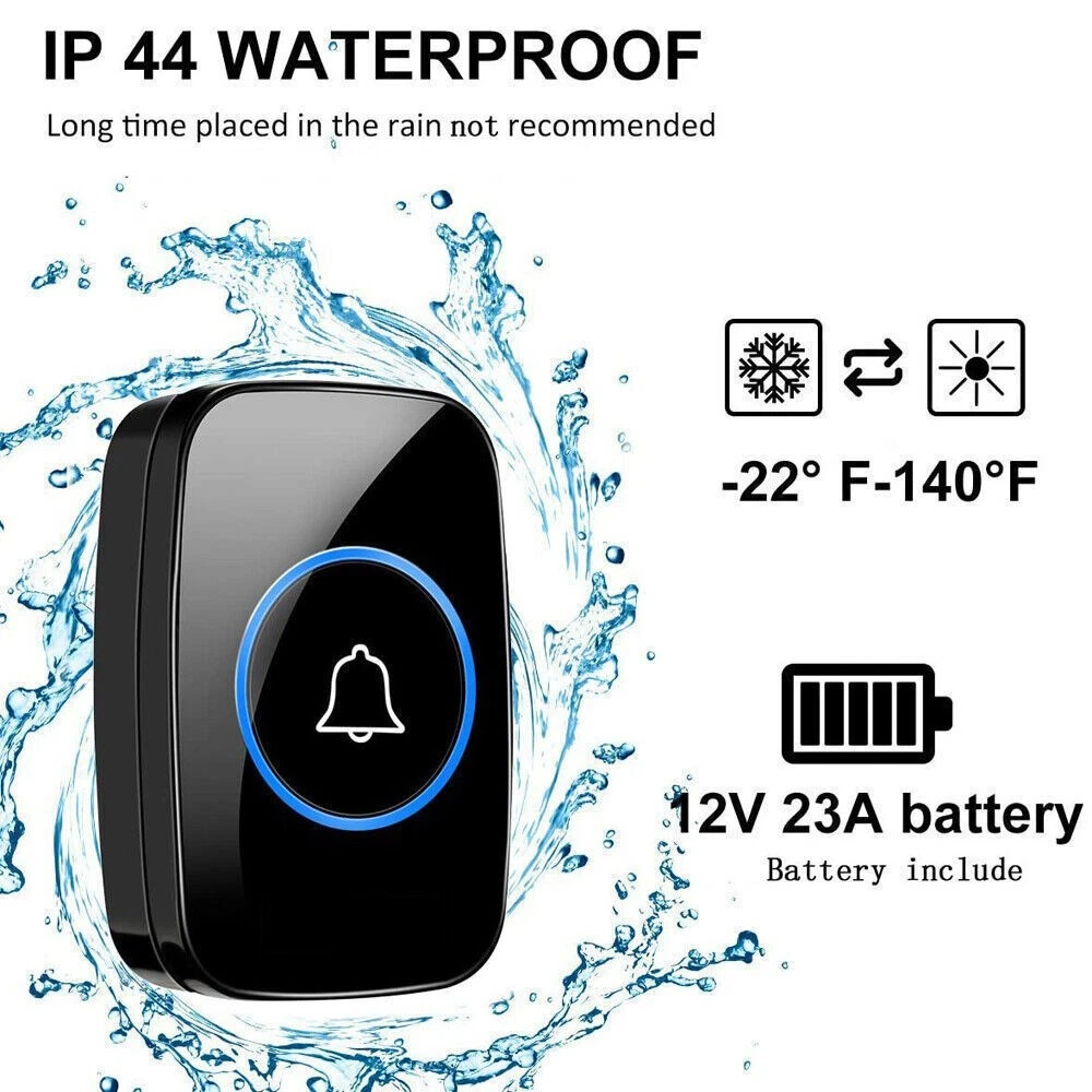 #A 1/2x Receivers+1x Transmitter Features: 【Personalize】:All receivers will ring no matter which push button is pressed, but each door has a different tone, so you know where your guests are. If you want the push button and receiver to work one-to-one, please try the steps in "How to clear the frequency and re-pair". 【Longer Range】:Up to 1000 Feet (300m) in the open air from the transmitter (150m if there are walls). Either you are occupied in the bedroom or at the kitchen, our wireless doorbell kit can remind you that someone is calling from outside. Never worry about missing visitors. 【60 Melodies & 5 Levels Volume & LED Flash】:The wireless doorbell offers a wide selection of 60 tunes for your choice. 5-level of volume range from 0dB to 110dB, silent mode with just LED flash is available when you don't want to be disturbed. 【IP44 waterproof】:The doorbell push button is rated IP44 and weatherproof for outdoor use,the doorbell chime is suitable for any home, townhouse, apartment, office, school, hospital, hotel or other application. Our wireless doorbell is certified by CE, RoHs, FCC. 【Expandable and Easy Installation】:Expand your existing doorbell system with up to 8 transmitters and unlimited receivers. Simply plug the main doorbell chime into a wall outlet, install the push button with provided double sided tape or screws. Specification: Maximum 1000ft operating range in open area 38 unique ringtones 3 volume levels LED indicators Volume range: 25 to 80dB Dimension: Receiver: 2.56 x 3.74 x 0.94 inch; Transmitter: 2.01 x 2.95 x 0.79 inch; Package Includes: 1-2x Receivers(please choose the qty you need) 1x Transmitter Tapes / Screws / Stickers #B 1/2x Receivers+1x Transmitter Feature: 300m/1000ft Operating Range With this wireless doorbell operating range up to 300m/1000ft, no matter where you are, you will never miss the visitor. You can smartly add up to 20 same plug-in doorbell receivers and doorbell battery-operated transmitters. Blue LED Indicator When pressing the wireless doorbell battery-operated transmitter, the blue indicator light on the wireless doorbell with 1/2 receivers will flash to remind you of the visitor's arrival. At the same time, the indicator light on the transmitter will remind visitors that the doorbell's receiver has sounded. IP44 Dustproof & Waterproof IP44 doorbell transmitter with a special dustproof & waterproof structure could work between -4 °F to 159 °F, can withstand extreme weather conditions. Enjoy the freedom to install it indoors, outdoor door frames, or in your garden. Innovative Memory Function With a smart storage function, this doorbell's wireless cordless plug-in receiver can remember your last tune and volume even if a power outage, no need to set it again every time. 10 Years Press Life After smart testing, the doorbell plug-in wireless transmitter can be pressed 100,000 times. It needs to be pressed 25 times a day for normal household use and 91250 times a year, so it can be used for 10 years. Easy to Install 1. Adhesive Patch Mounting: Use the included double-sided adhesive to stick the doorbell wireless cordless button on the wall. 2. Screw Mounting: There is a screw groove on the back cover of the doorbell battery-operated button, you can use the attached screws to fix it on the wall. Widely Use The plug-in door chime and cordless doorbell button are very popular because of their easy-to-install and set up function. You could install it anywhere inside, house, garden, garage, office, etc. Warm Tips: 1. Please tear off the battery insulation film before use. 2. Do not stick the doorbell wireless transmitter on the metal door frame or metal object. Pacakge Includes: Option 1: 1*Transmitter (includes 1*23A,12V battery) 2*Receiver Option 2 : 1*Transmitter (includes 1*23A, 12V battery) 1*Receiver #C 1/2x Receivers+1x Transmitter Feature: Classic Wireless Doorbell - Stylish modern design, artful with simplicity, elegant and unique. Excellent materials keeps itself from getting higher temperature & interference. Waterproof & Dustproof, remote transmitter button is rated IP44 weatherproof. Works between -4 °F to 140 °F; withstands various harsh weather conditions, acceptable for outdoor use. Long Operating Range - Operating range up to 1,000ft/300m in open area ensures you to hear the bell and answer the door in time. Either you are occupied a few rooms away or on another floor, in the garden or kitchen, you will always be easily informed when someone is calling from outside, nsures you will never miss a visitor. 36 Melodies & Adjustable Volume - The wireless doorbell offers a wide selection of 36 chimes for your personal taste, you can have a Christmas doorbell during the christmas season, for example, and more. 4-level of volume range from 25dB to 110dB to meet your needs for different occasions. Flashing light with audio alert indicators which is easy for people including the hearing impaired to notice. Easy Installation & Using - Screws and double-sided adhesive tapes included for easy be fixed to the doorframe of the transmitter. Easily plug receiver into an electrical outlet (no batteries required for main receiver). Install just plug it in location you need it to be heard, then you put the button where you want someone to push the button. Remembers your last melody and volume level after a power outage; no need to reset to your previous settings. Multi Use - It is fit for home, apartment, classroom, office, villas and more. You can use our doorbells to train dogs, using it to quiet down classrooms, when you ring the bell, the students will know it’s time to move on to the next group, the kids are loving it also. And it can be a paging device for the elderly, can signal for care when they need it most. Specifications: Plugs into Any Standard Wall Outlet. Flashing Light Indicator. Wireless Range: 1000ft maximum in the open air Internal Sounds: 36 Chimes Volume: 4 level adjustable levels (25db to 85db) Receiver Powe