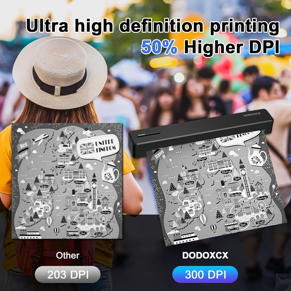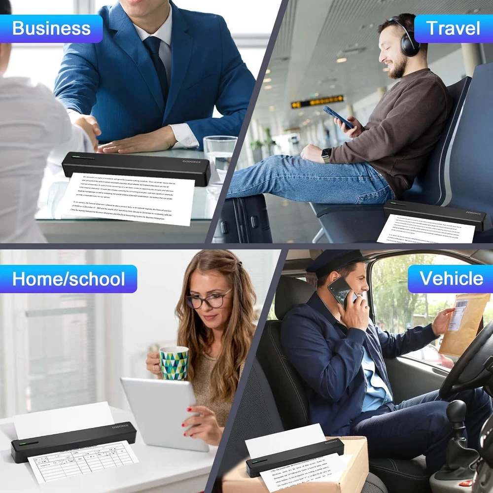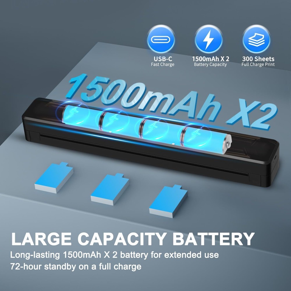 About this item Small Printer: The Portable Mini Printer is compact and lightweight, tipping the scales at just 1.1 pounds. It's highly portable for on-the-go use, occupying a space comparable to that of two smartphones. This printer can be conveniently slipped into your bag, enabling you to work from any location. Travel Printer: Exceptional Print Quality & Durable Battery Life: Enjoy sharp and clear prints with this compact travel printer, equipped with 2pcs 1500mAh internal batteries that allow for uninterrupted printing for up to 2 hours or 260 pages on one charge. Boasting an impressive 90-day standby capability, this portable printer is an essential tool for busy professionals and mobile students. Inkless Printer: The wireless printer provides a cost-effective solution for daily printing tasks, eliminating the need for ink, toner, and ribbon replacements. Utilizing cutting-edge thermal printing technology, you can effortlessly print recipes, forms, letters, homework, educational resources, and travel paperwork. With each sheet of thermal paper priced at just $0.07, you can save hundreds of dollars annually. It's ideal for home, small office, and educational settings. (Please note: This portable printer is a thermal printer and is designed to work exclusively with thermal paper, not conventional copy paper.) Mobile Printer: This portable label printer seamlessly pairs with iOS and Android smartphones via Bluetooth, doubling as a compact printing solution for laptops and desktop computers. It's ready to go in just 5 minutes from unpackaging, ensuring a quick and effortless setup. (Note: For smartphone usage, be sure to download the corresponding app beforehand.) Customizable Paper Dimensions: Produce documents in a range of sizes from 2 to 8.5 inches to suit different requirements. Product dimensions: 3.5 x 13 x 3.3 inches