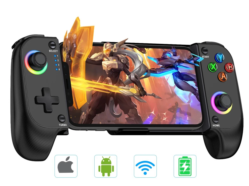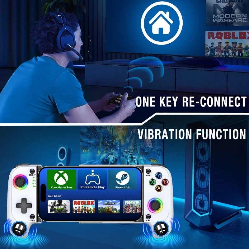 White Black 【PLAY ANY CONTROLLER SUPPORTED APP GAMES】 The wireless phone controller is designed to enjoy unstoppable gaming experience, work for iPhone/Android, support nearly all cloud gaming services including Xbox Game Pass, Playstation Remote Play, Steam Link, GeForce NOW, MFi Apple Arcade & hundreds of popular mobile games like Call of Duty, Roblox, Minecraft, etc. The mobile controller perfects your mobile gaming experience beyond a console by making it happen anywhere, anytime, to anyone! 【WIRELESS IPHONE GAME CONTROLLER WITH RGB & NO DEAD ZONE】 Only hold on 'B+HOME', you can connect controller for iphone with phone via Bluetooth. The phone game controller have Rainbow and 6 single color LED modes, you can switch LED colors or modes to build your own exclusive gaming ambiance! The Hall effect joystick provide ultra precise control, No drift, No deadzone! It helps you gain dominant position of games faster and the performance and game experience has been improved qualitatively! 【ADJUSTABLE TURBO & 8H PLAYING TIME】 The iOS/android controller has adjustable TURBO function (5/12/20 shots/s), free your fingers and make you easier to win in action game. Dual vibration motors enhance the game immersion, provide you realistic and stimulated gaming experience! Built-in rechargeable 600mAh high capacity battery provides over 8 hours game playing, and it can be fully charged within 2-3 hours. Never worry about game interruptions, enjoy your gaming time! 【STRETCHABLE DESIGN & CASE FRIENDLY】 The scalability of iphone controller for gaming allows you to install a 10-17.5cm phone, don't have to remove your phone case every time. Non slip rubber provides a secure fit that won’t come loose while gaming. And the grip with texture provides better comfort and a delicate feel, allowing you to play games for a long time without feeling tired! 【WHAT YOU GET & CUSTOMER SERVICE】 1X Phone Controller for iPhone/Android; 1X USB C Charging Cable; 1X User Manual for Phone Controller for Android. We are dedicated to providing customers with the best products and services. Matching the 'Shanwan Controller APP', collecting a large number of games and gaming platforms, and support for online upgrade of the controller.