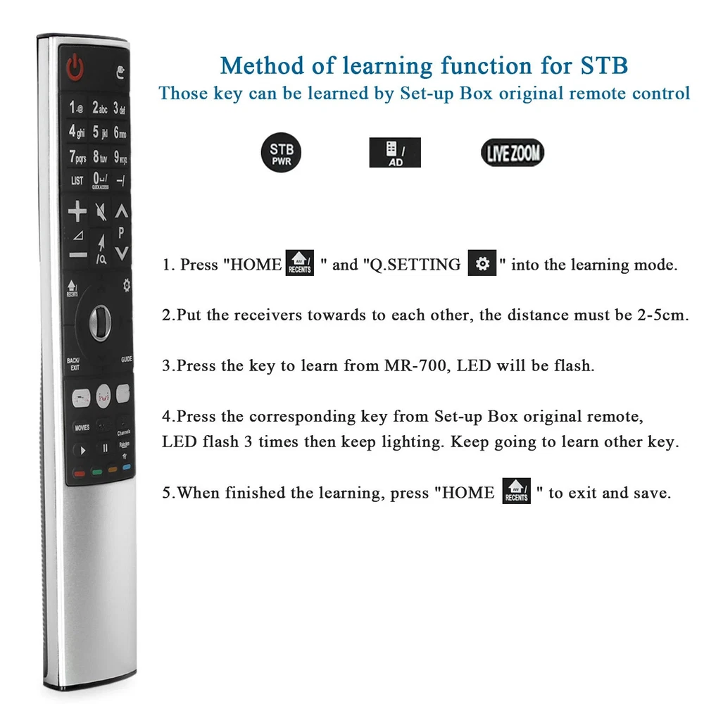 Product Description Wireless Remote Control For LG Smart TV AN-MR700 AN-MR600 AN-MR650 AKB75455602 A Specifications: Model Number: MR-700 Condition: New Compatible Brand: For LG Material: ABS Material Colour: As Shown Requires 2 x AA batteries, batteries are not included Substitute For AN-MR700 AN-MR600 AKB75455601 AKB75455602 Compatible TV Models: OLED65G6P-U OLED77G6P-U OLED55E6V OLED55E6P OLED65E6V OLED65E6P OLED65E6P.OLED65E6V, OLED55E6V, OLED65G6V, OLED65E7P, OLED55E7P, OLED65E7P, OLED65G7P, OLED65W7P, OLED77G6P, OLDE65C7P, OLED55C7P, OLED65G6P, OLED65G6P-U, OLED65G6PU, OLED77G6P-U, OLED77G6PU, 49SK8000, 49SK8100, 49SK8500, 55SK8000, 55SK8100, 55SK8500, 55SK9500, 65SK8000, 65SK8100, 65SK8500, 65SK9500, 75SK8100, OLED55B8, OLED55G8, OLED55E8, OLED65E8, OLED65B8, OLED65C8, OLED65E8, OLED65G8, OLED65W8, OLED77C8, OLED77W8 Package include: 1x TV Remote Control 1x Receiver Payment Shipping Returns Contact Us We accept all verified payments from ebay. Orders will be shipped after receiving cleared payment. Payment due within 7 days after auction ends and for buy it now listings. We ship most of our orders within 24 hours, and may up to 48 hours. If you want faster shipping way. Please contact us before making payment. Sometimes due to problems with our transportation company system, your shipping information may be delayed to update. We recommend that you try again after 3-4 days. If you still haven't checked the shipping information, you can contact us by ebay message. Always believe we can figure things out with communication, if it comes to return, the pacakge must be intact and the same as you receive. If you have any questions, please feel free to email our service specialists 24 Hours a Day, 7 Days a Week. We will reply you ASAP. Return/refund is accepted within 30 days after the buyer receives the item. NO exchange will be accepted after 30 days from the date when the item is received. Please contact us first before returning your product!!! If you have any questions, our Customer Service staffs welcome you to email us. We strive to answer all questions and resolve any problems as quickly as possible. You can contact us 7*24, we will reply at the first time, and we will surely solve your problems. Note: 1.We try our best to reply to your emails as soon as possible, however, due to high volume of daily incoming emails and time zone difference, we may not be able to reply your emails immediately. Please allow 1 business days for us to response. If you do not receive any reply from us, please check your email ensuring your mailbox has not reached full size. 2.Due to some ISP SPAM filter settings, you may not be able to receive our replies; if you have problems receiving our emails, you may need to use a different email account to contact us. 3.Please give us the opportunity to resolve any problem. We understand the concerns and frustrations you might have, and will try our best to resolve the issues. Please email us before leaving any negative feedback or open any dispute on PayPal. 4.We care about our valued customers, and will always try to help you. So if you have any problems, please e-mail us immediately. Payment We accept all verified payments from ebay. Orders will be shipped after receiving cleared payment. Payment due within 7 days after auction ends and for buy it now listings. Shipping We ship most of our orders within 24 hours, and may up to 48 hours. If you want faster shipping way. Please contact us before making payment. Sometimes due to problems with our transportation company system, your shipping information may be delayed to update. We recommend that you try again after 3-4 days. If you still haven't checked the shipping information, you can contact us by ebay message. Returns Always believe we can figure things out with communication, if it comes to return, the pacakge must be intact and the same as you receive. If you have any questions, please feel free to email our service specialists 24 Hours a Day, 7 Days a Week. We will reply you ASAP. Return/refund is accepted within 30 days after the buyer receives the item. NO exchange will be accepted after 30 days from the date when the item is received. Please contact us first before returning your product!!! Contact Us If you have any questions, our Customer Service staffs welcome you to email us. We strive to answer all questions and resolve any problems as quickly as possible. You can contact us 7*24, we will reply at the first time, and we will surely solve your problems. Note: 1.We try our best to reply to your emails as soon as possible, however, due to high volume of daily incoming emails and time zone difference, we may not be able to reply your emails immediately. Please allow 1 business days for us to response. If you do not receive any reply from us, please check your email ensuring your mailbox has not reached full size. 2.Due to some ISP SPAM filter settings, you may not be able to receive our replies; if you have problems receiving our emails, you may need to use a different email account to contact us. 3.Please give us the opportunity to resolve any problem. We understand the concerns and frustrations you might have, and will try our best to resolve the issues. Please email us before leaving any negative feedback or open any dispute on PayPal. 4.We care about our valued customers, and will always try to help you. So if you have any problems, please e-mail us immediately. powered by