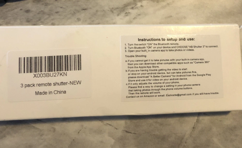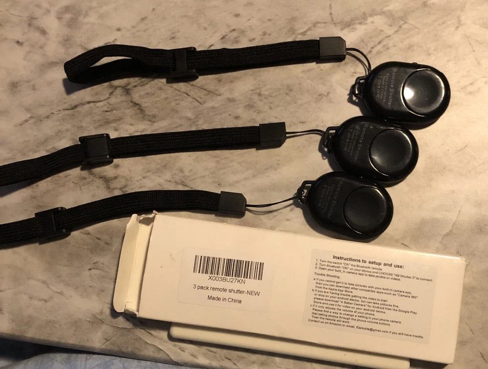 Open box. Item is as pictured. Capture every moment with ease using this wireless remote shutter compatible with most smart devices including Android, iPhone, iPad, and more. This convenient and lightweight device features Bluetooth connectivity and a maximum range of 33 feet, allowing you to take pictures from a distance without missing a beat. With a universal design and wrist strap included, this remote shutter is perfect for photographers of all levels. The device requires 1 Cr2 battery which is included in the package. Take your photography to the next level with this must-have accessory.