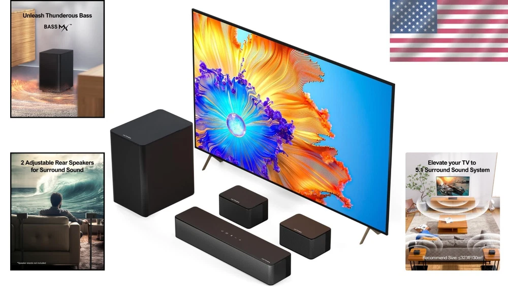Wireless Subwoofer and Adjustable Speakers – Ultimate 5.1 Soundbar Experience ‹ › ‹ › ‹ › ‹ › ‹ › ‹ › ‹ › ‹ › ‹ › ‹ › Wireless Subwoofer and Adjustable Speakers – Ultimate 5.1 Soundbar Experience Step into a world of audio excellence with our Wireless Subwoofer and Adjustable Speakers, designed to transform your home entertainment into a cinematic experience like never before. Key Features: Immersive Surround Sound: Experience sound that envelops you with SurroundX technology, converting 2.0 PCM to a captivating 5.1 surround signal, ensuring every sound moves around you. Enhanced Clarity: Featuring aerospace-grade magnets, the speakers deliver crisp and distinct surround sound that will elevate your viewing pleasure. Adjustable Rear Speakers: Enjoy dynamic audio with two wired rear speakers and one powerful subwoofer, with volume customizable across three levels via remote control. Customized Audio Experience: Personalize your sound environment with adjustable surround and bass levels. Choose between three unique audio settings tailored for movies, dialogue, or music with a simple press of the remote. Deep, Room-Filling Bass: Experience thunderous bass powered by Ultimate BASSMX Technology, with adjustable volume for subwoofer bass levels to match your mood. Effortless Setup & Sophisticated Design: Achieve seamless connectivity through various wired and wireless options. With clear instructions and a sleek design, this soundbar is perfect for your TV stand, cabinet, or under your television. Why Choose Our Surround Sound System? Indulge in the ultimate audio experience with our state-of-the-art Wireless Subwoofer and Adjustable Speakers. Perfect for movie nights, gaming sessions, and listening to your favorite albums, it brings real-life sound into your home with effortless sophistication. Utilize adjustable features to suit your precise audio preferences and enjoy a rich and immersive sound environment. Experience cinematic greatness within your living space by investing in your own home theater system. Elevate your audio journey—order your Ultimate 5.1 Soundbar now! Shipping Free & Fast Shipping - We offer free shipping to most of the USA with a normal delivery time of 3-7 days. However, due to the current situation, additional delivery time (up to 3 weeks) may be required for some items. Alternative Carriers - We may use alternative carriers (e.g. USPS, FedEx, UPS, etc.) to ensure your package arrives safely and on time. Due to the use of multiple carriers, we are unable to provide a tracking number automatically. Handling Time - Orders are processed and shipped within 1-2 business days of receiving cleared payment. Shipping Restrictions - Shipping to Alaska, Hawaii, Puerto Rico, Guam, and other US territories may incur shipping charges or delivery restrictions. Please contact us before ordering, or your order can be refunded/cancelled. State Restrictions - There may be restrictions based on your state of purchase. For example, certain items may not be shipped to California due to state regulations. Contact for Tracking Updates - If you require tracking updates or have any concerns about the delivery of your order, please feel free to contact us, and we will be happy to assist you. Return Please see our eBay Return Policy. Thank you. Payment We accept all major credit cards, PayPal, and Apple Pay for your convenience. Your payment information is secure and encrypted to ensure a safe and seamless transaction. Please complete your payment within 3 days of purchase to avoid any delays in shipping. Feedback Your feedback is extremely important to us. We strive to provide the best products and customer service possible. If you are satisfied with your purchase, please take a moment to leave us a positive review. If you have any concerns or issues with your order, please contact us before leaving negative feedback. We are committed to resolving any problems and ensuring your satisfaction. Contact Us If you have any questions or concerns, please feel free to reach out to our customer support team. You can contact us through the eBay messaging system. We are available Monday to Friday, 9:00 am to 5:00 pm EST, and we will do our best to respond to your inquiry within 24 hours. Thank you for supporting our small family business! UPC: 642380742998 Unit Quantity: 1.0 count Item Height: Sound Bar System Item Length: Sound Bar System Item Width: Sound Bar System Connectivity: Bluetooth,HDMI,Auxiliary,Optical Features: Bass Boost,Surround Sound Rear Speakers,Deep Bass with BASSMX Technology,Easy to Set Up,Decent Design Audio Inputs: 3.5 mm Jack,Digital Optical TOSLINK,HDMI,Stereo RCA Smart Home Compatibility: Not Set Surround Sound Formats: PCM 5.1 Compatible Brand: Not Set Compatible Model: Universal Brand: Unbranded Type: Soundbar Model: Sound Bar System Shape: Rectangular System Configuration: 5.1 Channel Color: Black RMS Power: 320 W Driver Size: 5.25 in Impedance: 4 Ohms MPN: Not Set Unit Type: Unit Material: Metal Year Manufactured: Not Set Country/Region of Manufacture: Not Set Plug Regional Fitment: Not Set Manufacturer Warranty: Not Set Battery Capacity: Not Set Item Weight: 11.7 lbs