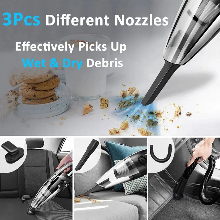 Most Buyer Like: Description: Name: Wireless Handheld Vacuum Cleaner Charging Volt: 7.4V (work with car charger and cellphone charger) Rate Power: 120W Power Supply: Lithium Battery Size: 32*6cm Color: Black Battery Capacity: 2200mah Working Time: About 25-30 Minutes Charging Time: 3-4 Hours Dry/Wet: Yes Charger: USB charger Cable 1.Charging Status: Rechargeable battery USB shows red for normal charging and green for full charging 2.This wireless car vacuum cleaner is a wet and dry vacuum cleaner. When absorbing water, pay attention to open the front cover to drain water in time. What Package included: 1x Wireless vacuum cleaner 1x Long Nozzle 1x Nozzle brush 1x EVA hose 2x Connectors 1x Portable bag 1x English Manual