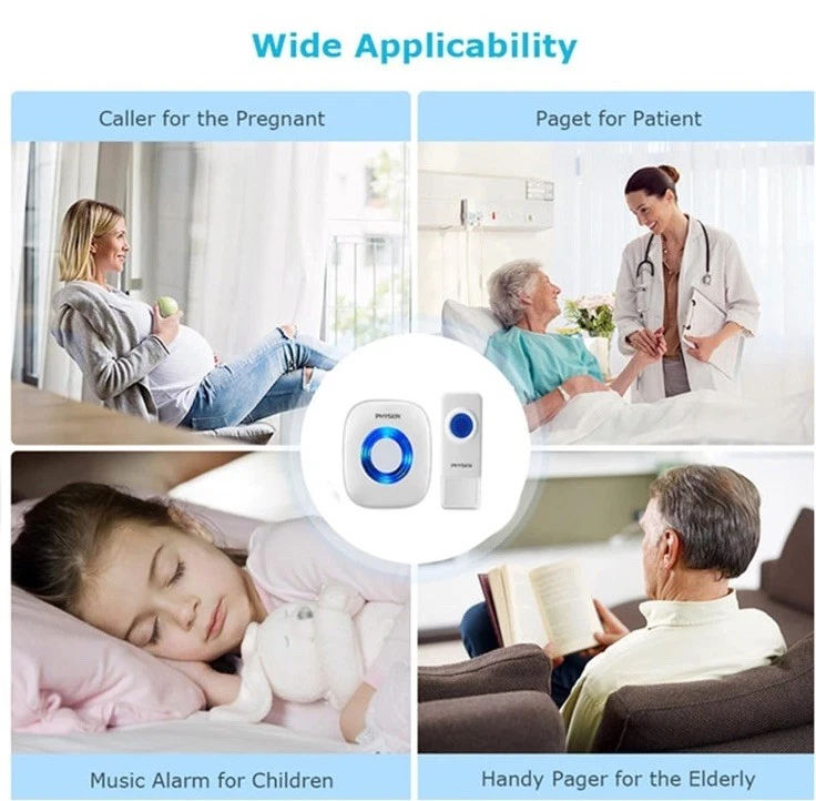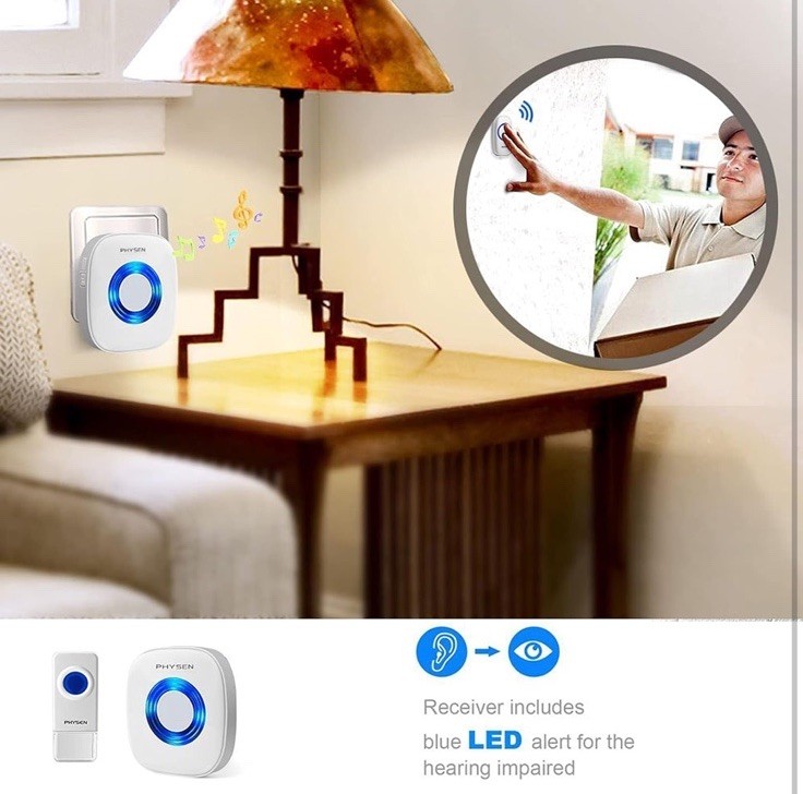 The PHYSEN Wireless Doorbell is a modern, square-shaped chime kit that operates at a distance of up to 1300 feet. It includes 2 remote transmitters and 4 plug-in smart doorbell receivers, all powered by AC and battery - specifically 120 volts (AC). The doorbell features adjustable 58 tones and 5 volume levels, including a mute mode, along with LED indicators for added convenience. With a waterproof design and self-adhesive/screw-in installation method, this wireless doorbell is durable and easy to install in any home setting. The brand PHYSEN offers a warranty of 18 months and 24-hour customer service, making it a reliable choice for home improvement needs.