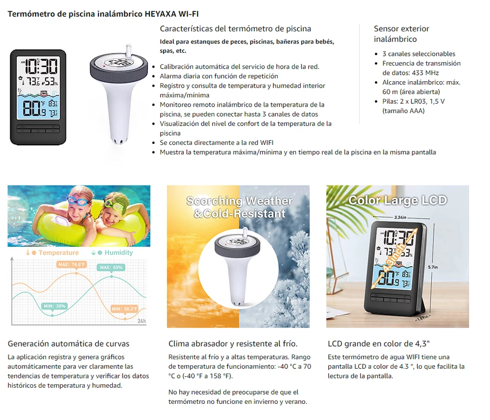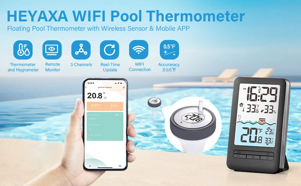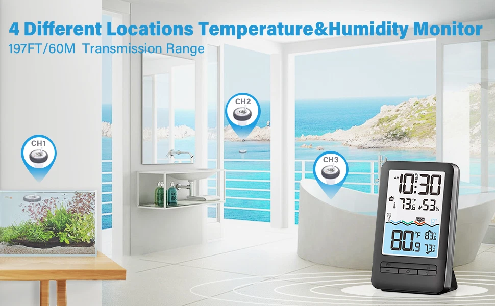 Enhance your monitoring experience with our WiFi Water Thermometer featuring a generous 4.3” Large Color LCD screen and adjustable brightness control. The vivid display ensures effortless readability, while the four brightness levels (10%, 40%, 70%, 100%) allow for customized viewing without disturbing your sleep. Stay informed with unparalleled accuracy and convenience. With outdoor sensors in place, effortlessly track indoor and outdoor temperature and humidity in real-time, all conveniently displayed on a single screen. Plus, access 24-hour records via the dedicated app, complete with temperature and humidity curves for comprehensive analysis. Designed for versatility and durability, our IPX7 Waterproof Wireless Thermometer is perfect for various applications, from fish ponds to baby baths. Equipped to connect up to three outdoor sensors (package includes one), monitor multiple environments simultaneously for a healthier living space. Experience freedom with dual power modes. Utilize battery mode for effortless portability, allowing you to hang it on walls or place it on your coffee table wire-free. Switch to charging mode for uninterrupted usage, eliminating concerns of power outages and battery replacements. Enjoy seamless flexibility with easy mode switching. Upgrade your monitoring game today with our WiFi Water Thermometer, the ultimate solution for accurate, hassle-free temperature and humidity tracking.