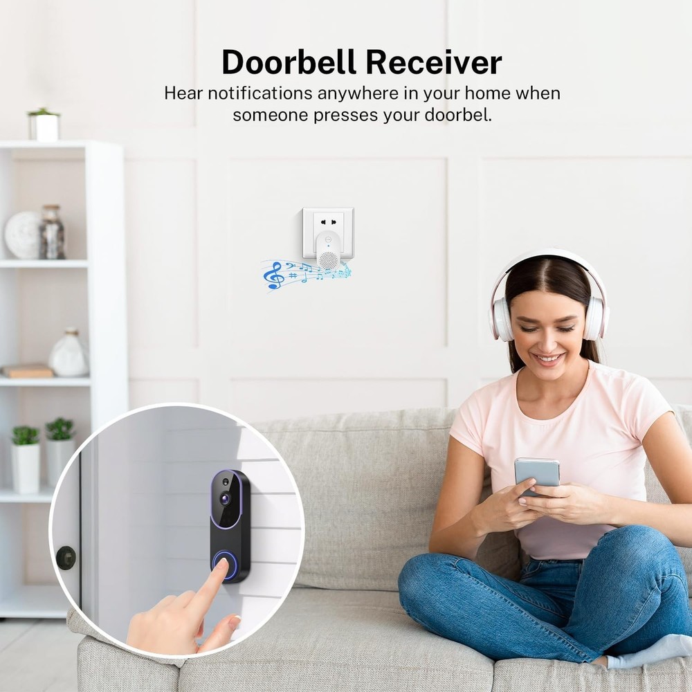 Wireless WiFi Video Doorbell Smart Phone Door Ring Intercom Security Camera Bell item description: Smart AI Recognition: Advanced algorithms detect human activity while filtering out pets and vehicles, so you only receive meaningful notifications. Clear Two-Way Audio: Communicate directly with visitors through built-in audio, whether you're at home or away. Secure Cloud Storage: Protect your recordings with AES-128 encrypted cloud storage, supporting live view, playback, and easy sharing of important footage. Receiver Alerts: The included indoor receiver can be placed in any room to suit your needs. Multiple receivers can be linked to a single doorbell for enhanced coverage. Stable 2.4GHz Wi-Fi: Optimized for 2.4GHz networks, this doorbell provides smooth, consistent performance at all times. (5GHz not supported.) High-Definition Night Vision: Four IR LEDs and an intelligent sensor capture clear, detailed video even in pitch-black conditions.