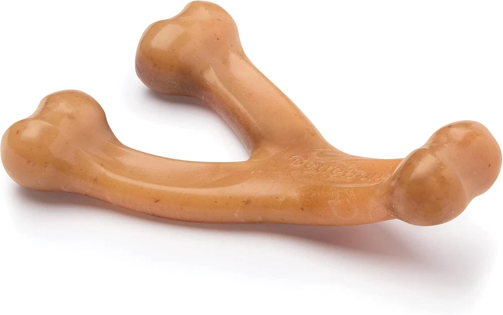 DURABLE, LONG-LASTING – Super chewer? Bring it on. Benebones are tougher than real bones and last for weeks. REAL CHICKEN! – We infused 100% REAL CHICKEN for flavor. It tastes like chicken because it’s actually made with chicken. EASY TO PICK UP AND CHEW – The Wishbone is curved for a paw-friendly grip so your pup can quickly grab it and get a good chew going. Think about it: dogs don’t have thumbs. USA MADE – We make and source everything in the USA. HAPPINESS, GUARANTEED – Have an issue? Want to chat? Reach out to us directly and you’ll get a real person whose sole job is to make you and your pup happy. The Benebone Wishbone Dogs love to chew, especially on stuff that tastes like real chicken. The Wishbone is easy to handle, tastes awesome, and stands up to heavy chewing. About Benebone At Benebone, we started with the premise that dogs experience scent and flavor in a way we can’t even grasp. So we ditched the neon colors and loud squeaks. Inspired by a dog’s powerful sense of smell, we developed a long-lasting durable chew that’s jam-packed with real chicken. Once your dog takes a bite of our USA-made chews, he’ll be hooked. We’re Obsessed with Safety Too Wonder if Benebone is right for your dog? Here’s what you need to know. Since it’s hard, it’s important that your pup has strong teeth. If you’re unsure, check with your vet. Nobody likes an unexpected trip to the dentist. Keep an eye out for wear and tear. Within a month or so, we find that most dogs chew Benebone into submission. See the wear page on our website for helpful photos to determine when to replace yours. Keep away from households with peanut or other allergies. What’s Inside? Nothing but Nylon and Real Chicken for Tantalizing Flavor