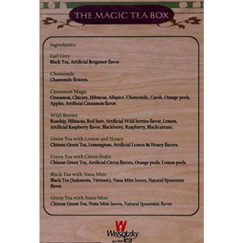Product Description World renowned since 1849, Wissotzky tea offers a tempting selection of 80 assorted teas. Wissotzsky Blood Orange & Mandarine Tea - A citrus orchard teaming with vitamin C. An exhilarating of tart Blood oranges and sweet Mandarines gives this infusion its unique flavor. Wissotzsky English Breakfast Tea - English Breakfast is a blend of the finest tea leaves growing in the hilly areas of Ceylon, India and Kenya. A classic blend based on the famous English tradition which makes a refreshing stimulating beverage. Wissotzsky Classic Tea This special home blend of superior quality black teas from India, Africa and Ceylon has been produced for nearly 160 years. A strong, full bodied tea blend with a rich flavor and aroma. Wissotzsky Earl Grey Tea - This unique blend of orange pekoe and pekoe black cut teas with its famous, luxurious natural oil of bergamot has been prepared according to the special recipe of the 2nd Earl of the House of Grey. Mediterranean Spearmint Wissotzsky Mediterranean Spearmint NANA Tea - A celebrated Mediterranean tradition with a cool refreshing breeze. The finest blend of selected tea leaves and fresh spearmint gives this aromatic infusion its unique scintillating flavor. Wissotzsky Chamomile Tea - Using fresh, dry, fragrant evergreen chamomile flowers, this aromatic herbal tea is famous, for its calming effects. It soothes and relaxes with each sip providing a totally tranquil feeling. Caffeine Free. Wissotzsky Cherry Tea - This mixture of the finest tea leaves with cherries, Hibiscus, and other fine ingredients gives you an unique dark red drink that combines tea with the natural flavor and aroma of cherries. – Wissotzsky Wildberry Tea - An exquisite blend of wild forest berries, blackberries, blackcurrant and raspberries creates an infusion with a rich flavor and fragrant aroma. Caffeine Free.