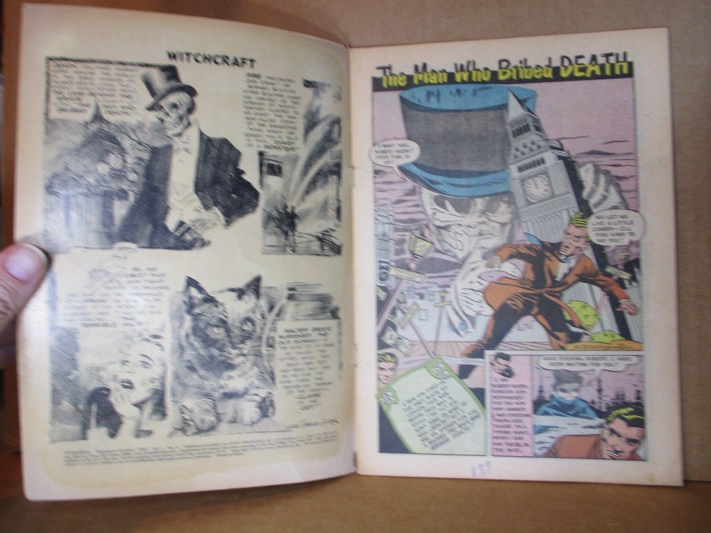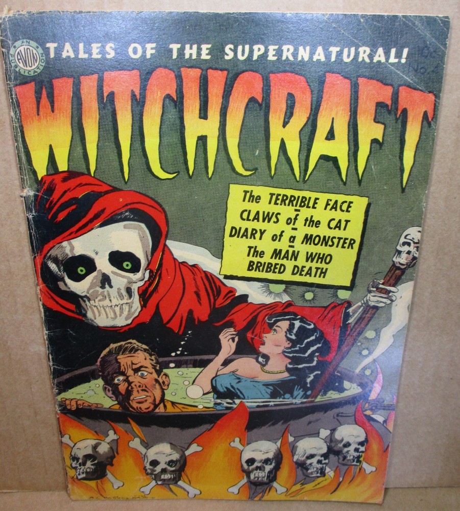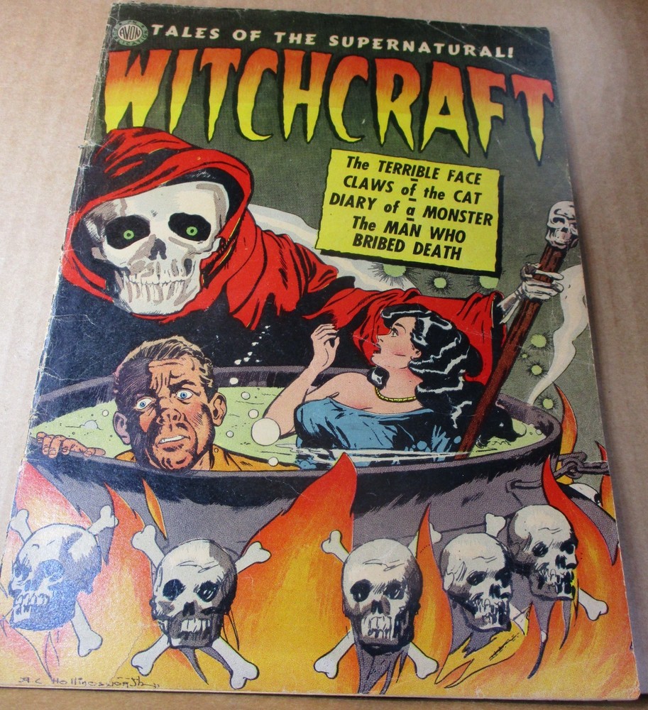 Rare Horror Comic: Witchcraft! This Auction Includes: LOT OF 1 VINTAGE COMIC BOOK: WITCHCRAFT #4, With The Incredible 'Boiling Alive" Cover With A Classic Bubbling Cauldron With Grim Reaper Depiction By The Legendary A.C. Hollingsworth. Perfect To Promote The "Man Who Bribed Death" Lead Story, Also Drawn By The Underrated Alvin Hollingsworth. The Bold Cover Exhibits The Stark Layout, Facial Expressions And Masterful Inking That Only Hollingsworth Could Achieve. And Note That Extraordinary Front Cover Looks Great On This Bright Clean Example. It' s Complete, Intact, And Supple, With Clean Bone-White Paper. It Is Unrestored And Has Great Eye-Appeal With No Severe Major Problems To Distract From The Riveting Black Magic Human Sacrifice Scene To Haunt Your Nightmares. Th is Is A Scarce Small Press Classic, And Much Like Issue #2 Which Is In High Demand, It's Got The Age And Potential To Become A Sought-After Commodity By This Highly-Collected Artist. Inside There Is Top-Notch Art By Legends Including Harry Lazarus, Everett R. Kinstler, Mort Meskin, And AC Hollingsworth. This Is From 1952, It Came Out At The Apex Of The Original Horror Craze So It Has The Shocking Content Including Good Girl Art, Occult Scenes, And Explicit Violence. THIS ANTIQUE COMIC HAD AN ORIGINAL PRICE OF TEN CENTS. That terrific skull cover is bold and clean and unblemished, please view our many assorted photographs. It is vibrant and lustrous, that epic front cover retains amazing gloss and has great eye-appeal. The cover whites are still snowy white, the logo is astonishingly bold, with some dings and bumps and a substantial amount of spine wear, and some light creasing, mostly non-color breaking. There is one edge tear, near the spine at bottom, which runs through the artist signature at left corner. On the reverse there's some corner creases along with some stresses and smudges, and there is a couple small edge tears, easy to overlook, at top and bottom near the spine. I took pictures at different angles so you can see all the flaws, this is a solid copy, suitable for a serious horror collection. Terrific acquisition for any Witchcraft fan or collector of American pop culture from the middle of the twentieth century. MATERIAL LIKE THIS SPOTLIGHTING ICONIC THEMES OF FILM, PULP FICTION, CINEMA AND LITERATURE NEVER LOSES APPEAL. This will be carefully bagged in ARCHIVAL MYLAR and packaged very well to ensure safe delivery. CLASSIC COVER PRE-CODE HORROR COMIC. We are now selling many LB Cole covers along with assorted pre-code horror comic-books, plus sci-fi, GGA, and crime, and even rare artwork, with more to come in the coming weeks. Many of you have dealt with us through our ads in CBM, CBG, O .P.G., etc. (Comic Book Marketplace, Comics Buyer's Guide, Overstreet Price Guide, +...) KEY COMICS is a long-term top rated ebay Seller and CGC Member Dealer that has specialized in Mail-Order Comics & Art for 35 years. WE LIST SCARCE & OUT-OF-PRINT COLLECTABLE COMICS FREQUENTLY, SO PLEASE CHECK BACK OFTEN! We accept PayPal; checks/MO. * * SATISFACTION GUARANTEED * * International Customers Welcome. Please add $12 for fast Priority-Mail shipping with Tracking within USA. Please contact us for details regarding International Shipping Rates as the ebay shipping calculator is usually inaccurate. Buy additional item(s) and save: just add $2 for each slabbed comic-book. KEY COMICS IS ALWAYS DEALING IN COMICS & ART! (1930's to `80's) Add keycomics to your Favorite Sellers list if you buy/sell/trade rare comics or artwork! For more samples from our diverse inventory, including CGC-Graded vintage comics, plus more hot horror and sci-fi comics, and rare Comic Line Art, and DC COVER ART from the historic Jack Adler Collection that we listed in assorted categories, please see our ebay store.