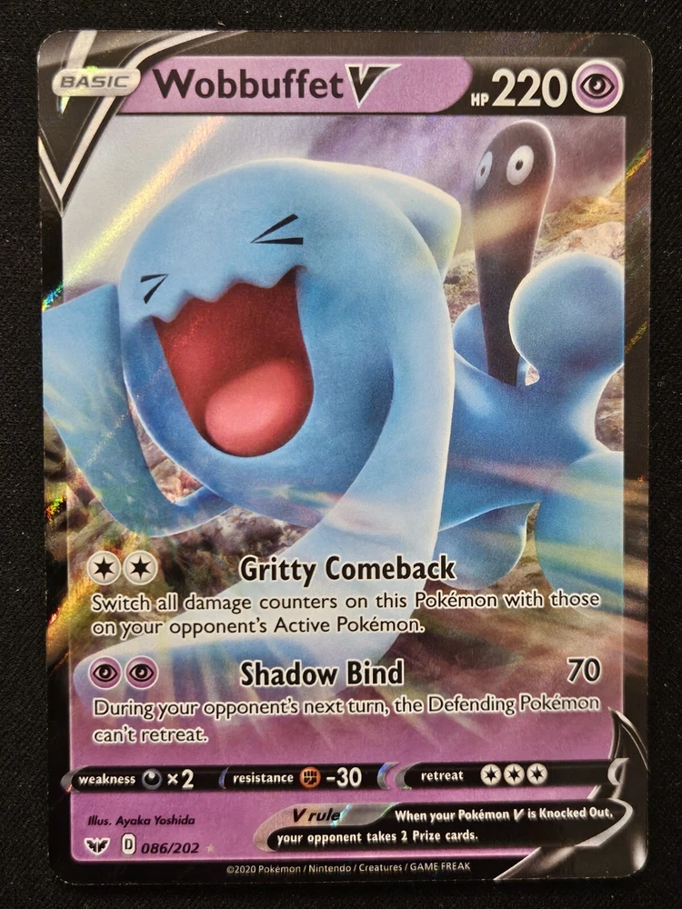 Wobbuffet V 086/202 Sword & Shield Extended Art Ultra Rare Holo Pokémon 2020 NM. NM is an estimation. Actual card received will be very similar to card pictured but may not be identical. Pleach out with any questions before purchase and we would be happy to assist you. Shipping info: All graded cards are shipped securely in bubble mailer and cardboard box; regardless of price. TCG singles/playsets are shipped PWE with tracking when applicable. Single cards will be packaged with penny sleeve, top loader and team bag. Playsets will be penny Sleeved in a Card saver 2. Please note that PWE orders will have fewer tracking updates and may show delivered when scanned through your states/cities sortation center or post office. Final delivery may take up to 5 days after this date to arrive to your home. PWE orders from Puerto Rico need to have The United States listed as your country. Orders with Puerto Rico listed as the country cannot be shipped and may be cancelled. Please reach out with any concerns before contacting ebay and we'd be happy to assist you. Please note that due to inventory accuracy, purchases will not be cancelled before or after shipping. Please reach out with any questions before purchase and we would be happy to assist you.