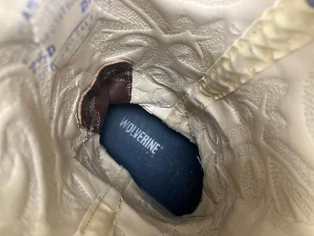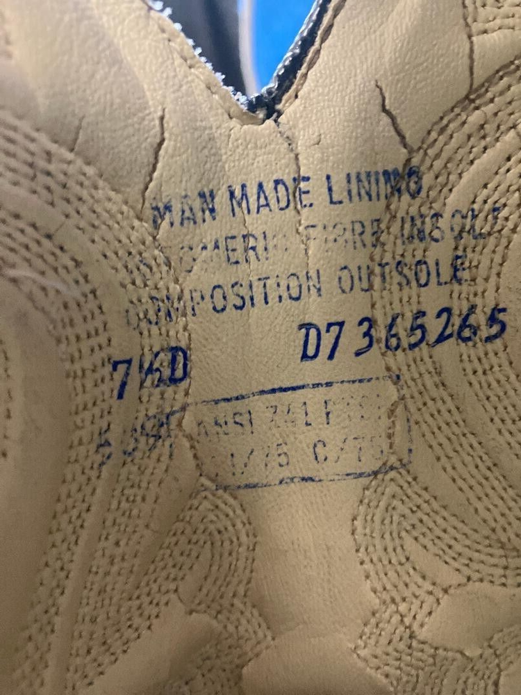 Step into comfort and style with these Wolverine men's gray two tone steel toe western work boots - men's size 7.5 D. Designed with a classic almond toe shape and pull-on closure, these boots are perfect for any occasion, whether it's travel, activewear, party/cocktail, casual, or workwear. The mid-calf shaft style and regular calf width provide a snug fit, while the leather upper material and fabric lining material ensure durability and breathability. Featuring arch support, waterproofing, comfort, steel toe, and breathable qualities, these boots are ideal for all seasons, including winter, summer, fall, and spring. The rubber outsole material guarantees a firm grip on any surface, making them suitable for any adventure. Show off your Wolverine character with pride and enjoy the USA-themed design of the Wolverine Rancher Waterproof Steel-Toe Wellington boots. These are qualified steel toe boots. The boots are in perfect condition.